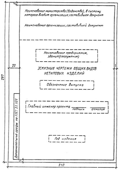 ВЫПОЛНЕНИЯ ЭСКИЗНЫХ ЧЕРТЕЖЕЙ System of design documents for construction. Дата введения 1995-09-01 1 ОБЛАСТЬ ПРИМЕНЕНИЯНастоящий стандарт устанавливает требования к разработке эскизных чертежей общих видов нетиповых изделий (конструкций, устройств, монтажных блоков), выполняемых к основным комплектам рабочих чертежей зданий и сооружений различного назначения. 2 НОРМАТИВНЫЕ ССЫЛКИВ настоящем стандарте использованы ссылки на следующие стандарты: ГОСТ 2.301-68 ЕСКД. Форматы ГОСТ 21.101-93 СПДС. Основные требования к рабочей документации 3 ОПРЕДЕЛЕНИЯВ настоящем стандарте применяют следующие термины: 3.1 Эскизный чертеж общего вида нетипового изделия - документ, определяющий исходную конструкцию нетипового изделия, содержащий упрощенное изображение, основные параметры и технические требования к изделию в объеме исходных данных (задания), необходимых для разработки конструкторской документации. 3.2 Групповой эскизный чертеж общего вида нетипового изделия - документ, содержащий постоянные и переменные данные исполнении двух и более нетиповых изделий. 3.3 Нетиповое изделие (конструкция, устройство, монтажный блок) - изделие, впервые разработанное и изготовленное, как правило, на месте монтажа (в заготовительной мастерской монтажной организации) технологических, энергетических, санитарно-технических и других систем. 4 ОБЩИЕ ПОЛОЖЕНИЯ4.1 Эскизные чертежи общих видов нетиповых изделий, конструкций, устройств, монтажных блоков (далее - эскизные чертежи) выполняют в соответствии с требованиями настоящего стандарта и других стандартов Системы проектной документации для строительства (СПДС). 4.2 Эскизные чертежи разрабатывают на несложные в изготовлении технологические, энергетические, санитарно-технические и другие нетиповые изделия (конструкции, устройства, монтажные блоки (кроме оборудования индивидуального изготовления), опорные конструкции и конструкции креплений трубопроводов, воздуховодов, электропроводок, технологического и другого оборудования и связанных с ними обслуживающих площадок и др.), предусмотренные соответствующими основными комплектами рабочих чертежей, при отсутствии их серийного производства, типовых чертежей (документации массового применения), стандартов или других документов на эти изделия. 4.3 Несложные нетиповые изделия (конструкции, устройства, монтажные блоки) изготовляют, как правило, на месте монтажа (в заготовительной мастерской монтажной организации) технологических, энергетических, санитарно-технических и других систем. 4.4 На каждое нетиповое изделие выполняют отдельный эскизный чертеж. Исключение составляет группа изделий, обладающих общими конструктивными признаками, на которые допускается выполнить групповой эскизный чертеж. 4.5 Эскизные чертежи, как правило, выполняют на листах форматов А4 и А3 по ГОСТ 2.301. 4.6 Эскизному чертежу присваивают самостоятельное обозначение, состоящее из обозначения соответствующего основного комплекта рабочих чертежей - по ГОСТ 21.101, через точку шифра "Н" и порядкового номера эскизного чертежа в пределах данного основного комплекта. Пример - 2345-11-ОВ.Н1, 2345-11-ОВ.Н2 4.7 При выполнении к соответствующему основному комплекту рабочих чертежей более трех эскизных чертежей их рекомендуется комплектовать в виде отдельного выпуска. Отдельному выпуску "Эскизные чертежи общих видов нетиповых