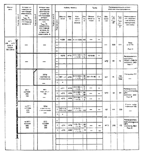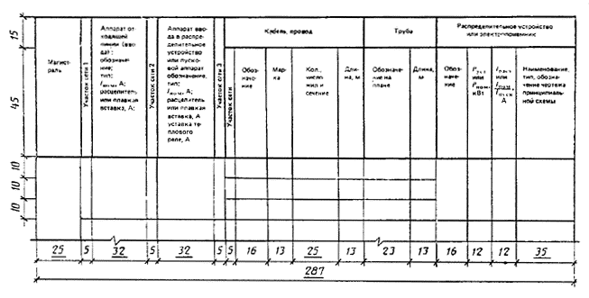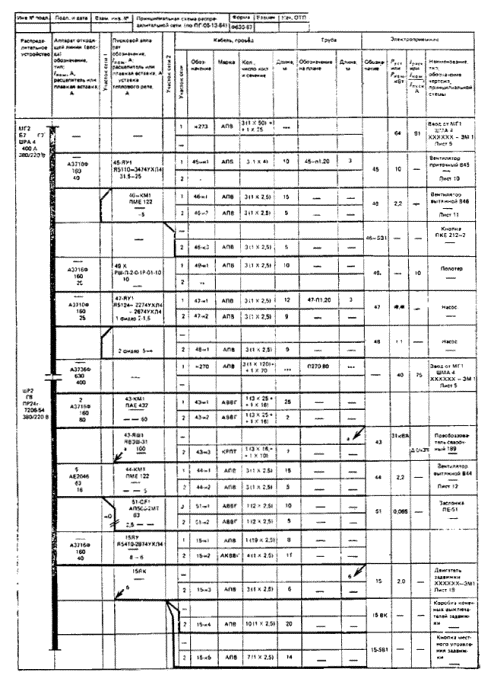 2.5. При разработке принципиальных схем по формам 2 и 3 руководствуются следующим: принципиальную схему выполняют в однолинейном изображении, при этом нулевой проводник отдельной линией не изображают; в трехфазных трех- и четырехпроводных сетях изображение и обозначение фаз указывают только для одно- и двухфазных линий; условные графические обозначения электроприемников, пусковых и защитных аппаратов на принципиальной схеме, как правило, не изображают, а указывают над линией их буквенно-цифровые обозначения, типы и технические данные; электроприемники, подключаемые непосредственно к питающей магистрали, показывают на принципиальных схемах питающей сети; в графе «Магистраль» (форма 2) указывают буквенно-цифровые обозначения магистрали, ее координаты по плану расположения электрического оборудования (при необходимости), тип шинопровода и его номинальный ток (материал и сечение шин - для магистралей нетипового изготовления), напряжение; в графе «Распределительное устройство» (форма 3) указывают буквенно-цифровое обозначение распределительного пункта или распределительного шинопровода, его координаты по плану расположения электрооборудования (при необходимости), тип (для НКУ - обозначение габаритного чертежа общего вида), напряжение, Руст и Iрасч - для пунктов, соединенных «в цепочку»; в графе «Iрасч...», кроме указанных параметров (при необходимости), указывают величину потери напряжения DU, %. На принципиальных схемах не приводят: технические данные электрооборудования, марки, сечения и длины кабелей и проводов, обозначения и длины труб, если они поставляются комплектно с технологическим оборудованием или предусмотрены рабочей документацией нестандартизированного оборудования; марки, сечения и длины проводов в пределах НКУ; марки, сечения и длины кабелей и проводов, обозначения и длины труб для электроприемников, для которых всю необходимую информацию о кабелях, проводах и трубах невозможно привести на принципиальной схеме (например, сети с разветвленными цепями управления). Данные об этих кабелях, проводах и трубах помещают в кабельном или кабельнотрубном журналах. На чертеже каждой принципиальной схемы приводят в таблице по форме 4 потребность кабелей и проводов, а в таблице по форме 5 - потребность труб. В таблицы потребности включают кабели, провода и трубы, технические данные и длины которых указаны в принципиальной схеме. Потребность кабелей и проводов длина, м