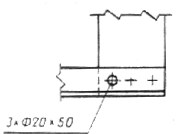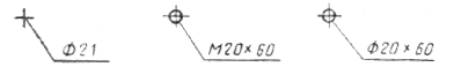 Черт. 5 6. Монтажные болты и заклепки следует изображать согласно табл. 2 и 4 только тогда, когда на одном чертеже помещены болты и заклепки как заводские, так и монтажные. Если на чертеже все болты или заклепки монтажные, допускается флажки не изображать, а на чертеже привести примечание: «Все болты (заклепки) монтажные». 7. Отверстие с резьбой следует изображать согласно пп. 2 и 3. Для сквозных отверстий с резьбой должны быть указаны вид и диаметр резьбы (черт. 6), для несквозных отверстий с резьбой - вид, диаметр и длина резьбы, а также длина несквозного отверстия (черт. 7). 8. Овальные отверстия изображаются сплошными толстыми линиями. В обозначении на полке линии-выноски следует указывать ширину и общую длину отверстия согласно черт. 8.