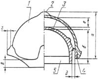 Настоящий стандарт распространяется на пластмассовые каски, предназначенные для защиты головы работающих от механических повреждений, воды и электрического тока при производстве строительных, строительно-монтажных и ремонтно-строительных работ. 1. ОСНОВНЫЕ ПАРАМЕТРЫ И РАЗМЕРЫ1.1. Каски должны изготавливаться двух размеров со ступенями регулирования длины несущей ленты не более 10 мм: I - от 54 до 58 см; II - от 58 до 62 см. По требованию потребителя допускается изготавливать каски больших размеров от 62 до 64 см. 1.2. Основные размеры касок должны соответствовать указанным на чертеже и в табл. 1. Схематическое изображение конструкции каски а - высота корпуса; б - глубина внутренней оснастки; в - ширина козырька; г - ширина полей; д - кольцевой зазор; е - вертикальный безопасный зазор; 1 - корпус; 2 - ребро жесткости; 3 - амортизатор; 4 - подвеска; 5 - несущая лента