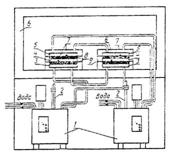 где d - толщина образца (высота рамки), м; Dt - перепад температур на поверхностях образца, °С; qср - средняя плотность теплового потока, проходящего через образец, Вт/м2; rк - термическое сопротивление контакта между образцом и теплообменником или слоями образца, м2×К/Вт, Rк = 0,005 м2×К/Вт (для теплоизоляционных материалов и изделий не учитывают); п - число контактов. Среднюю плотность теплового потока (qср) рассчитывают как среднее арифметическое значение плотности теплового потока, входящего в образец (q1) и выходящего из него (q2). 6.2. Плотность теплового потока (q1,2) в Вт/м2, входящего в образец и выходящего из него, вычисляют по формуле q1,2 = К1,2 Еq1,2, (2) где К1,2 - градуировочный коэффициент преобразователя теплового потока, Вт/(м2×мВ); Еq1,2 - термо-ЭДС преобразователя теплового потока, мВ. 6.3. За результат испытания образца принимают значение теплопроводности, вычисленное по формуле l = lср ± Dl, (3) где lср - среднее арифметическое значение теплопроводности образца по десяти измерениям, Вт/(м×К); Dl - граница погрешности результата измерений при доверительной вероятности 0,95, Вт/(м×К) Dl = q + e, (4) где q - доверительная граница неисключенной погрешности, определяемая в соответствии с Методикой поверки рабочих средств измерений теплопроводности, удельной теплоемкости и температуропроводности твердых тел (МИ 115-77), утвержденной в установленном порядке; e - доверительная граница случайной погрешности, определяемая по ГОСТ 8.207-76. 6.4. Теплопроводность материала или изделия вычисляют как среднее арифметическое значение теплопроводности испытанных образцов. 6.5. Погрешность определения теплопроводности (Dl) данным методом составляет не более 7%. ПРИЛОЖЕНИЕ 1Обязательное ТЕХНИЧЕСКАЯ ХАРАКТЕРИСТИКА УСТАНОВКИ ДЛЯ ОПРЕДЕЛЕНИЯ ТЕПЛОПРОВОДНОСТИ СТРОИТЕЛЬНЫХ МАТЕРИАЛОВ И ИЗДЕЛИЙ Установка для определения теплопроводности должна содержать: тепловой блок с двумя металлическими теплообменниками с размером рабочих поверхностей от 200 ´ 200 мм до 300 ´ 300 мм, служащих для создания и поддержания заданных температур на противоположных поверхностях образца (схема теплового блока приведена на черт. 1); один или два преобразователя теплового потока, в зависимости от средней температуры испытания образцов; не менее четырех преобразователей с диаметром проволок не более 0,3 мм (по два на каждую поверхность теплообменника) для измерения температуры поверхностей образца; блок задания и регулирования температуры теплообменников; блок коммутации и измерения сигналов от преобразователей температуры и теплового потока; узел зажима образца теплообменниками; теплоизоляционный кожух для устранения тепло потерь через торцевые грани образца. Погрешность установки должна быть не более 5%. Схема теплового блока установки