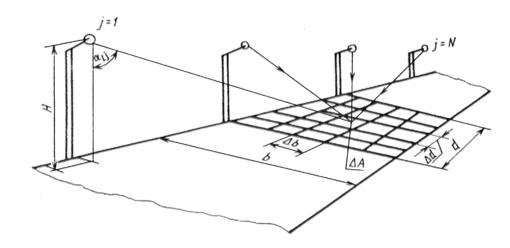 где d - длина контрольного участка, м; Dd - длина элементарной площадки, Dd ³ 5 м; b - ширина проезжей части улицы, м; Db - ширина элементарной площадки, Db £ 5 м. 4.6. Перед измерением средней яркости фасадов зданий и сооружений на плане улицы (площади) определяют зоны вероятного нахождения наблюдателей. Яркомер располагают на линии, исходящей из центра зоны наблюдения в направлении освещаемого объекта. Расстояние от яркомера до контролируемого участка поверхности освещаемого объекта должно быть не менее десятикратного минимального размера этого участка. Яркомер устанавливают на высоте 1,5 м от поверхности дорожного покрытия. 4.7.