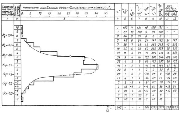 Действительные отклонения dxj из всех выборок были распределены по интервалам, после чего было подсчитано количество отклонений в каждом интервале (частоты), построена гистограмма и выполнены все промежуточные вычисления в таблице. Правильность заполнения таблицы в соответствии с п. 4 приложения 1 была проверена тождеством