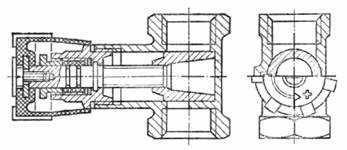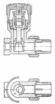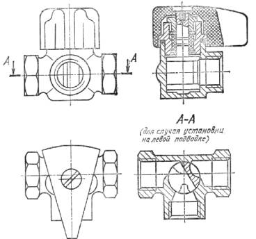 Пример условного обозначения трехходового регулирующего крана в универсальном исполнении, с условным проходом Dу 20 мм, с вентильным регулирующим устройством: Кран КРТВ 20 ГОСТ 10944-75 То же, в одностороннем исполнении, для установки на правой подводке: Кран КРТВп 20 ГОСТ 10944-75 То же, проходного регулирующего крана, с условным проходом Dу 15 мм, с пробковым регулирующим устройством: Кран КРПП 15 ГОСТ 10944-75 То же, регулирующего крана двойной регулировки, с условным проходом Dу 15 мм, с шиберным регулирующим устройством: Кран КРДШ 15 ГОСТ 10944-75 2. ТЕХНИЧЕСКИЕ ТРЕБОВАНИЯ2.1. Краны должны изготавливаться в соответствии с требованиями настоящего стандарта по рабочим чертежам, утвержденным в установленном порядке. 2.2. Конструкция регулирующего устройства крана должна обеспечивать плавное изменение теплоотдачи нагревательного прибора. 2.3. На корпусе или регулирующем устройстве крана типа КРД для определения положения регулирующего устройства при монтажном регулировании должна быть нанесена градуировка, соответствующая паспортным характеристикам крана. На рукоятках кранов всех типов должны быть нанесены необходимые указатели для потребительского регулирования. 2.4. Краны должны иметь ограничители крайних положений регулирующего устройства. Конструкция ограничителя должна исключать возможность изменения его положения потребителем. 2.5. Конструкция кранов должна позволять производить их установку с расположением оси шпинделя во всех промежуточных положениях от горизонтального до вертикального (рукояткой вверх). 2.6. Корпус крана и детали, соприкасающиеся с теплоносителем, должны изготавливаться из латуни марки ЛС-1Л по ГОСТ 17711-93, в качестве сальниковой набивки должен применяться фторопластовый уплотнительный материал по МРТУ 6-6-05-870-66 или сальниковая набивка по ГОСТ 5152-84. 2.7. Конструкция и материал рукояток кранов должны исключать их нагрев св. 45 °С на поверхности. 2.8. Литые детали кранов не должны иметь раковин, трещин, следов литников, шлаковых включений. Поверхности деталей должны быть очищены от облоя. 2.9. Присоединительные концы кранов должны выполняться муфтовыми по ГОСТ 6527-68 или ниппельными. В кранах типов КРА и КРД с Dу 10 мм присоединительные концы со стороны нагревательного прибора должны выполняться только ниппельными. 2.10. Противоположные присоединительные концы в кранах должны располагаться на одной оси, отводной присоединительный конец в кранах типа КРТ - под углом 90°. Отклонение не должно превышать: 1° для муфтовых и 3° для ниппельных и муфтово-ниппельных концов. 2.11. Трубная резьба присоединительных концов должна выполняться по ГОСТ 6357-81, класс точности В. Для других соединений выполняется метрическая резьба по ГОСТ 9150-81 и ГОСТ 24705-81 с допусками по ГОСТ 16093-81, грубый класс точности. 2.12. Сбеги резьб, недорезы, проточки и фаски должны выполняться по ГОСТ 10549-80. 2.13. Наличие сорванных витков, а также заусенцы на поверхности резьбы, препятствующие соединению деталей, не допускаются. Рванины и выкрашивания на поверхности резьбы не должны выходить за пределы среднего диаметра резьбы и их общая протяженность не должна превышать 1/3 витка. 2.14. Предельные отклонения размеров деталей кранов с необработанными поверхностями должны соответствовать указанным в ОСТ 1010, 9-й класс точности; с обработанными поверхностями - в соответствии с указан