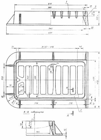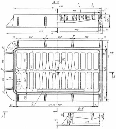 1 - решетка; 2 - корпус; 3 - обозначение настоящего стандарта, тип дождеприемника, год выпуска и товарный знак Большой прямоугольный дождеприемник (тип ДБ)