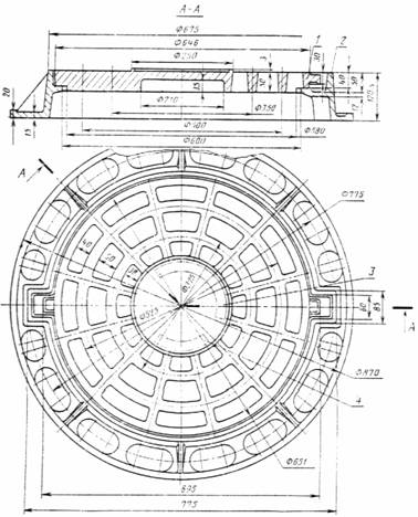 1 - решетка; 2 - корпус; 3 - обозначение настоящего стандарта, тип дождеприемника, год выпуска и товарный знак Черт. 2 Круглый дождеприемник (тип ДК)