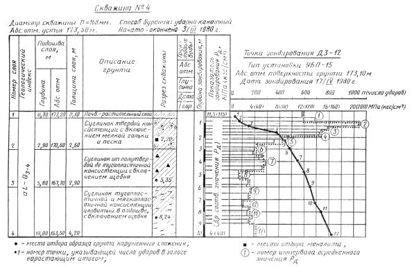 5.3. Условное динамическое сопротивление грунта рд при ударно-вибрационном зондировании определяется согласно рекомендуемому приложению 4. 5.4. Результаты динамического зондирования следует оформлять в виде непрерывного ступенчатого графика изменения по глубине значений условного динамического сопротивления рд с последующим осреднением графика и вычислением средневзвешенных показателей зондирования для каждого инженерно-геологического элемента (рекомендуемое приложение 5). 5.5. Масштаб графиков динамического зондирования следует принимать: по вертикали - 1 см на графике равен 1 м глубины зондирования; по горизонтали - 1 см на графике равен 2 МПа (20 кгс/см2) условного динамического сопротивления. Допускается изменение масштабов графиков при обязательном сохранении соотношения между указанными выше масштабами вертикальных и горизонтальных координат. 5.6. Графики динамического зондирования следует, как правило, совмещать с инженерно-геологическими колонками горных выработок, расположенных вблизи (не далее 5 м) от точки динамического зондирования, и с инженерно-геологическими разрезами.