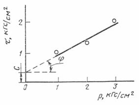 Показатель сцепления в грунте, определяемый отрезком, отсекаемым на оси ординат прямой t = f(р) |