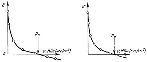 5.2. По величинам относительной деформации следует построить график зависимости относительных деформаций от вертикального давления d = f(p) (см. обязательное приложение 6). Точки графика, соответствующие ступеням давления, следует соединить лекальной кривой. Величина давления набухания (рн) соответствует точке пересечения кривой с осью давления (р) (см. график 1 приложения 6) или точке предполагаемого пересечения продолжения кривой графика d = f(p) с осью давления (р) (см. график 2 приложения 6) 5.3. По результатам испытаний усадки на основании записей испытаний грунта (см. рекомендуемое приложение 5) следует: а) определить объем грунта на каждый момент измерения по формуле