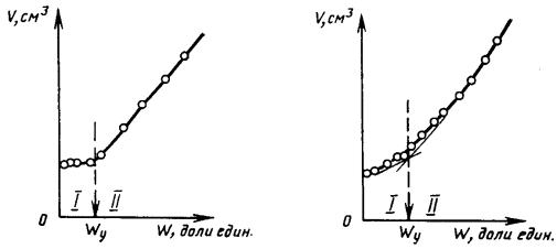 где h, d, V и hк, dк, Vк - соответственно начальные и конечные значения высоты, диаметра, см, и объема образца грунта, см3. 5.4. По величинам объема и влажности на каждый момент времени следует построить график зависимости изменения объема образца от влажности V = f (W) (см. обязательное приложение 7). За величину влажности на пределе усадки (Wy) следует принять влажность, соответствующую точке перегиба графика V = f (W) (см. график 1 приложения 6). Допускается нахождение точки перегиба путем восстановления перпендикуляра к графику из точки пересечения касательных к двум ветвям кривой (см. график 2, приложения 6), соответствующим первому и второму этапам сушки образца. Приложение 1Справочное Пояснения терминов, используемых в стандарте