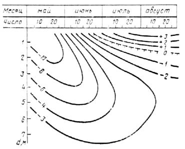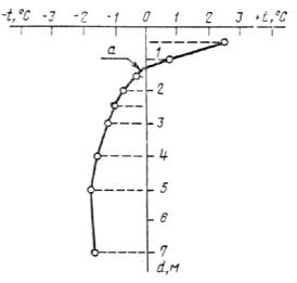 Примечания: 1. Графы 4 и 5 заполняются при камеральной обработке результатов измерений. 2. При использовании гирлянды электрических термометров с мостом сопротивлений в первой строке графы 3 записывают отсчет при положении переключателя К0, в последующих строках - отсчеты сопротивлений при положении переключателя соответственно К1, К2, ..., Кn. 3. При использовании «заленивленных» ртутных термометров в графу 3 вписывают отсчеты по шкале термометра с погрешностью 0,1 °С. 4. Поправку в графе 4 вносят по паспорту (аттестату) данного электрического термометра сопротивлений и измерительного прибора или ртутного термометра, а также по результатам их последней поверки. 5. В графу 6 вносят сведения: о температуре воздуха, измеренной термометром-пращем; мощности слоя талого грунта, определяемой зондированием (щупом); состоянии скважины; неисправности аппаратуры и др. ПРИЛОЖЕНИЕ 5Рекомендуемое ОБРАЗЦЫ ГРАФИЧЕСКОГО ОФОРМЛЕНИЯ РЕЗУЛЬТАТОВ ИЗМЕРЕНИЙ ТЕМПЕРАТУРЫ ГРУНТАГрафик распределения температуры t, °С, грунта по длине d, м, для одноразовых измерений температуры Объект _________________________________________________________ Планшет № ______________________________________________________ Скважина № _____________________________________________________ Отметка устья ____________________________________________________ Дата измерений ___________________________________________________ Примечание. В переходной зоне точка сопряжения а находится встречной экстраполяцией прямых, продолженных из смежных зон до пересечения.