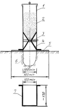 2 мм > d > 0,2 мм, (2) где d - крупность зерен наполняющего песка, мм; dmax - крупность зерен, выраженная максимальным размером квадратной ячейки верхнего контрольного сита, не более 2 мм; dmin - крупность зерен, выраженная минимальным размером квадратной ячейки нижнего контрольного сита, не менее 0,2 мм. При повторном использовании наполняющий песок должен быть пропущен через сита с размером отверстий, соответствующим максимальному и минимальному размеру частиц песка, используемого для проведения испытания. 3.2. Определение плотности наполняющего песка 3.2.1. Лист основания помещают на горизонтальной плоской поверхности. 1 - пескобак; 2 - песок; 3 - задвижка; 4 - загрузочная камера; 5 - лист основания; 6 - лунка; 7 - калибровочный сосуд Черт. 1 3.2.2. Пескобак аппарата с закрытой задвижкой полностью наполняют песком и