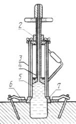 1 - изъятый грунт; 2 - шкала для считывания; 3 - калиброванный цилиндр; 4 - поршень; 5 - вода; 6 - застопоренный лист основания; 7 - резиновый баллон с толщиной стенки от 0,25 до 0,50 мм Черт. 2 сосуды для отбора пробы; штыри для фиксации листа основания от смещения; технические весы с пределом взвешивания 5 и 20 кг. 4.2. Проведение испытания 4.2.1. На поверхности подлежащего испытанию слоя разравнивают требуемую площадь, после чего устанавливают лист основания и закрепляют его, чтобы он не смещался. Аппарат через полый стержень поршня заливают водой, затем, слегка вдавив поршень, вытесняют из цилиндра воздух. После этого перекрывают наполнительное отверстие. 4.2.2. Аппарат помещают на лист основания и, отжав цилиндр, поджимают баллон на выровненную грунтовую поверхность. По шкале определяют объем (V0). Оттягивают поршень и снимают аппарат с листа основания. Через круглое отверстие в листе основания выкапывают лунку с примерно вертикальными стенками. Глубина лунки должна обеспечивать минимальный объем пробы в соответствии с п. 2.4. В стенках и дне лунки следует удалить выступающие острые части крупных обломков таким образом, чтобы избежать нарушения естественного сложения грунта. Изъятый при этом грунт следует тщательно собрать в сосуд. 4.2.3. Аппарат вновь устанавливают на листе основания и закрепляют, после чего поршень вдавливают до тех пор, пока баллон не прижмется к стенке полости. После этого на шкале считывают значение объема (V1). Без изменения положения прибора вытягиванием поршня воду из резинового баллона направляют в аппарат и повторно определяют объем V1. Если два считанных значения отличаются друг от друга не более чем на 2 %, то за основу следует брать их среднее значение. В противном случае следует повторить испытание. 4.3. Обработка результатов Значение плотности грунта (r) определяют в граммах на кубический сантиметр с округлением до 0,01 г/см3 по формуле