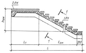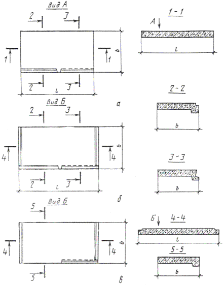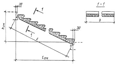 а - накладная проступь по серии 1.251.1-4, выпуск 1; б - то же, по серии 1.050.1-2, выпуск 1; 1 - скос для конечной проступи 1.4. Форма и основные размеры маршей должны соответствовать: типа ЛМ - указанным на черт. 1 и в табл. 1; » ЛМФ » на черт. 2 и в табл. 2; » ЛМП » на черт. 3 и в табл. 3. 1.5. Форма и основные размеры площадок должны соответствовать: типа 1ЛП указанным на черт. 4 и в табл. 4; » 2ЛП » на черт. 5 и в табл. 5; » ЛПФ » на черт. 6 и в табл. 6; » ЛПП » на черт. 7 и в табл. 7. 1.6. Форма и основные размеры накладных проступей должны соответствовать: типа 1ЛН указанным на черт. 8 и в табл. 8; » 2ЛН » на черт. 9 и в табл. 8. 1.4 - 1.6 (Измененная редакция, Изм. № 1). 1.7. Марши и площадки предназначены для применения в лестницах на расчетные временные нагрузки (при коэффициенте надежности по нагрузке γ = 1,2 и без учета собственного веса): 3,5 кПа (360 кгс/м2) - для жилых зданий; 4,7 кПа (480 кгс/м2) - для общественных зданий, производственных и вспомогательных зданий промышленных предприятий. 1.8. Элементы лестниц, при необходимости, изготовляют в двух вариантах исполнения: правом и левом - для лестниц с подъемом соответственно против часовой и по часовой стрелке. 1.9. Элементы лестниц изготовляют с отделкой верхних лицевых поверхностей следующих видов: с гладкой поверхностью из тяжелого бетона на обычном цементе; с шлифованной мозаичной поверхностью декоративного конструкционного слоя из бетона на обычном, белом или цветном цементах и на мраморном щебне (для площадок и накладных проступей); с облицовкой керамической плиткой (для площадок). (Измененная редакция, Изм. № 1). 1.10. Элементы лестниц обозначают марками в соответствии с требованиями ГОСТ 23009. Марка элементов лестниц состоит из буквенно-цифровых групп, разделенных дефисами. Первая группа содержит обозначение типа элемента лестницы и габаритные размеры: длину и ширину в дециметрах (значения которых округляют до целого числа), а для маршей дополнительно указывают координационную высоту марша (высоту вертикальной проекции) в дециметрах. Длину маршей типа ЛМП без нижней полуплощадки указывают в марке равной длине основного марша этого типа (с двумя полуплощадками). Для конечных площадок и накладных проступей, укладываемых на верхние конечные ступени маршей, первую группу дополняют строчной буквой «в». Таблица 1
