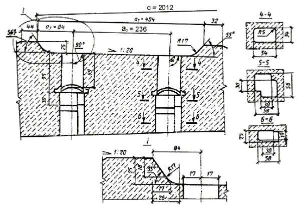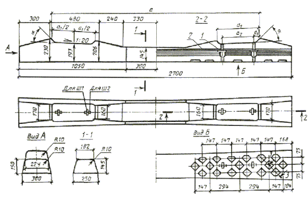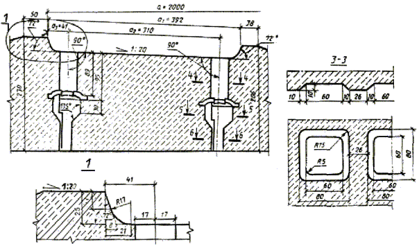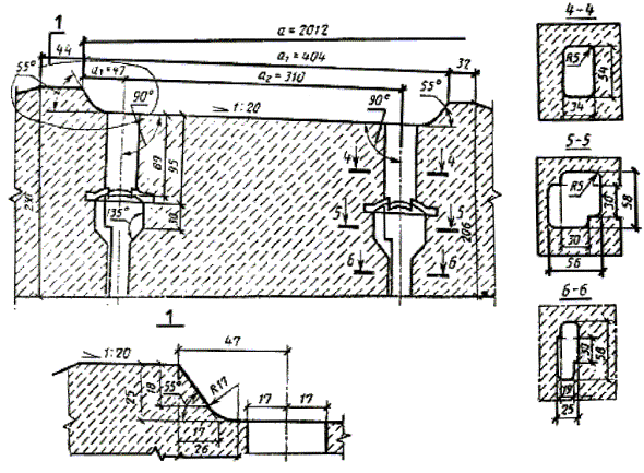 Примечания: 1. На кромках, примыкающих к подошве и торцам шпалы, допускаются фаски шириной не более 15 мм. 2. По согласованию изготовителя с потребителем допускается изготовлять шпалы, у которых размеры и расположение углублений на подошве отличаются от указанных на черт. 1, а форма и размеры вертикальных каналов для закладных болтов отличаются от указанных на черт. 2 - 4. 1.2.3. Шпалы обозначают марками в соответствии с требованиями ГОСТ 23009. Марка шпалы состоит из двух буквенно-цифровых групп, разделенных тире. Первая группа содержит обозначение типа шпалы (п. 1.2.1). Во второй группе указывают вариант исполнения подрельсовой площадки (табл. 1). Пример условного обозначения (марки) шпалы типа Ш1, первого варианта исполнения подрельсовой площадки: Ш1-1 1.2.4. В зависимости от трещиностойкости, точности геометрических параметров, качества бетонных поверхностей шпалы подразделяют на два сорта: первый и второй. Шпалы второго сорта предназначены для укладки на малодеятельных, станционных и подъездных путях. Поставку шпал второго сорта производят только с согласия потребителя. 1 - закладная шайба; 2 - проволочная арматура Сечение 3-3 приведено на черт. 3 Черт. 1 ПОДРЕЛЬСОВАЯ ЧАСТЬ ШПАЛЫ Ш1-1 Черт. 2 ПОДРЕЛЬСОВАЯ ЧАСТЬ ШПАЛЫ Ш1-2 Сечения 4-4, 5-5 и 6-6 приведены на черт. 2 Черт. 3 ПОДРЕЛЬСОВАЯ ЧАСТЬ ШПАЛЫ Ш2-1 Черт. 4 РАЗМЕЩЕНИЕ АРМАТУРЫ