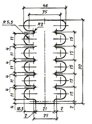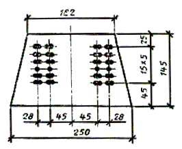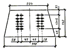 1.3.2. Шпалы следует изготовлять из тяжелого бетона по ГОСТ 26633 класса по прочности на сжатие В40. 1.3.3. Фактическая прочность бетона (в проектном возрасте, передаточная и отпускная) должна соответствовать требованиям ГОСТ 13015.0. 1.3.4. Нормируемую передаточную прочность бетона следует принимать равной 32 МПа (326 кгс/см2). 1.3.5. Отпускную прочность бетона принимают равной передаточной прочности бетона. 1.3.6. Марка бетона по морозостойкости должна быть не ниже F200. щебень фракции 20 - 40 мм в количестве не более 10 % от массы щебня фракции 5 - 20 мм по ГОСТ 10268; щебень из природного камня фракции 5 - 25 мм по ГОСТ 7392 при соответствии его всем другим требованиям ГОСТ 10268. 1.3.8. В качестве арматуры шпал следует применять стальную проволоку периодического профиля класса Вр диаметром 3 мм по ГОСТ 7348 и ТУ 14-4-1471-87. 1.3.9. Номинальное число арматурных проволок в шпале 44. Расположение проволок, контролируемое на торцах шпалы, должно соответствовать указанному на черт. 5. Расстояние по вертикали в свету между парами или отдельными проволоками, в случае их отклонения от проектного положения, не должно быть менее 8 мм. Допускается разворот пар проволок на 90° при сохранении указанного выше расстояния. Для обеспечения проектного расположения проволок могут применяться разделительные проставки, остающиеся в теле бетона шпалы (см. приложение 2). Допускается по согласованию изготовителя с потребителем применять проставки, отличающиеся от указанных в приложении 2. Снижение силы натяжения отдельных проволок сверх 10 %, вызванное проскальзыванием проволоки в захвате, не должно быть более чем у одной проволоки в шпалах первого сорта и у двух проволок в шпалах второго сорта. 1.3.11. Допускаются отклонения от номинального числа арматурных проволок при условии, что общая сила натяжения имеющихся проволок не менее указанной в п. 1.3.10. При этом предельные отклонения по числу проволок не должны превышать ±2 шт. 1.3.12. Концы напрягаемой арматуры не должны выступать за торцевые поверхности шпал первого сорта более чем на 15 мм и второго сорта - более чем на 20 мм. 1.3.13. Закладные шайбы должны соответствовать ГОСТ 23157. 1.3.14. Значения действительных отклонений геометрических параметров шпал не должны превышать предельных, указанных в табл. 3. Таблица 3 мм