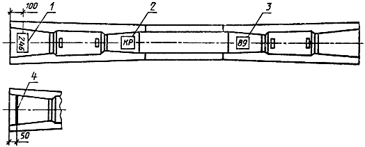 Примечания: 1. Допускается наличие на продольных кромках подрельсовых площадок отпечатков от сварных швов между несъемными подрельсовыми плитами и формой. 2. Допускается наличие на торцах шпал отпечатков элементов жесткости диафрагм глубиной не более 5 мм. 1.3.19. Глубина зазоров между проволоками и бетоном на торцах шпал не должна превышать 15 мм для шпал первого сорта и 30 мм для шпал второго сорта. 1.3.20. В шпалах не допускают: наплывы бетона в каналах для болтов, препятствующие свободной установке и повороту этих болтов в рабочее положение; местные наплывы бетона на подрельсовых площадках; провертывание болтов рельсового скрепления в каналах шпалы при завинчивании гаек; трещины в бетоне. Для формирования каналов для болтов допускается установка внутренних элементов, конструкцию и материал которых согласовывают с потребителем. 1.4. Маркировка 1.4.1. Маркировка шпал должна соответствовать требованиям ГОСТ 13015.2 и настоящего стандарта. 1.4.2. На верхней поверхности шпал штампованием при формовании наносят: товарный знак или краткое наименование предприятия-изготовителя - на каждой шпале; год изготовления (две последние цифры) - не менее чем у 20 % шпал каждой партии: В концевой части каждой шпалы краской наносят: штамп ОТК; номер партии. 1.4.3. Места нанесения маркировочных надписей указаны на черт. 6. Допускается нанесение товарного знака или краткого наименования предприятия-изготовителя и года изготовления на одной половине шпалы. 1.4.4. Маркировочные надписи следует выполнять шрифтом высотой не менее 50 мм. 1.4.5. На обоих концах шпалы второго сорта наносят краской поперечную полосу шириной 15 - 20 мм (см. черт. 6). МАРКИРОВКА ШПАЛЫ 1 - номер партии; 2 - товарный знак или краткое наименование предприятия-изготовителя; 3 - год изготовления; 4 - знак шпалы второго сорта Черт. 6 2. ПРИЕМКА2.1. Приемку шпал осуществляют партиями в соответствии с требованиями ГОСТ 13015.1 и настоящего стандарта. 2.2. Шпалы принимают: по результатам периодических испытаний - по показателям морозостойкости бетона и точности геометрических параметров шпал, за исключением размера а шпал типа Ш1-2; по результатам приемо-сдаточных испытаний - по показателям трещиностойкости шпал, прочности бетона (классу бетона по прочности на сжатие, передаточной и отпускной прочности), состояния каналов для болтов, точности размера а шпал типа Ш1-2, качества бетонных поверхностей шпал. 2.3. Периодические испытания шпал по показателям морозостойкости бетона проводят раз в год, по точности геометрических параметров - раз в месяц. 2.4. По точности геометрических параметров шпалы принимают по результатам выборочного контроля. При объеме партии шпал св. 3200 шт. план выборочного контроля следует принимать по ГОСТ 23616. 2.5. Для испытания на трещиностойкость от каждой партии отбирают контрольные шпалы в количестве 0,3 %, но не менее 3 шт. Партию принимают по трещиностойкости, если отобранные для испытаний шпалы выдержали контрольные нагрузки. Шпалу считают выдержавшей испытание на трещиностойкость, если при контрольных нагрузках не обнаружены видимые трещины в подрельсовых и среднем сечениях. За видимую принимают поперечную трещину в бетоне длиной более 30 мм от кромки шпалы и раскрытием у основания более 0,05 мм. При неудовлетворительном результате испытания на трещиностойкость допускается разделять партию на 