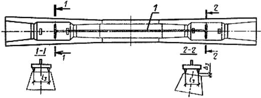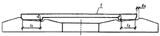 1 -шаблон или индикаторное устройство Черт. 7 3.5. Расстояние между упорными кромками углублений подрельсовых площадок разных концов шпалы а измеряют шаблоном, накладываемым одновременно на обе подрельсовые площадки шпалы (черт. 7). Расстояния между кромками