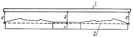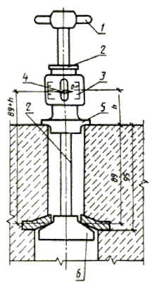 1 - измерительный прибор Черт. 8 3.7. Отклонение от прямолинейности подрельсовых площадок определяют по ГОСТ 13015 измерением наибольшего зазора между поверхностью площадки и ребром металлической поверочной линейки. 3.8. Глубину заделки в бетон закладных шайб контролируют приспособлением, вставляемым в канал шпалы и поворачиваемым на 90° (черт. 9). Отсутствие в каналах шпалы наплывов бетона, препятствующих установке и повороту болта в рабочее положение, а также провертывания болта при завинчивании гайки проверяют закладным болтом по ГОСТ 16017 с предельными плюсовыми отклонениями размеров головки. Проверяют все четыре канала контролируемой шпалы. СХЕМА УСТРОЙСТВА ДЛЯ ИЗМЕРЕНИЯ ГЛУБИНЫ ЗАДЕЛКИ ШАЙБ 1 - ручка; 2 - шток; 3 - шкала; 4 - указатель; 5 - корпус; 6 - головка Черт. 9 3.9. Толщину защитного слоя бетона над верхним рядом арматуры контролируют посередине шпалы методом, указанным на черт. 10. Допускается по согласованию изготовителя с потребителем контролировать толщину на торцах шпалы металлической линейкой. 3.10. Высоту шпалы проверяют штангенциркулем в поперечных сечениях посередине каждой подрельсовой площадки и посередине шпалы. СХЕМА ИЗМЕРЕНИЯ ТОЛЩИНЫ ЗАЩИТНОГО СЛОЯ БЕТОНА НАД ВЕРХНИМ РЯДОМ АРМАТУРЫ ПОСЕРЕДИНЕ ШПАЛЫ