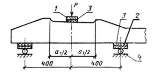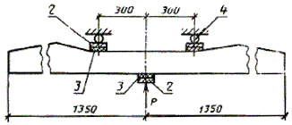 в среднем сечении шпалы Черт. 5 1.3. Характеристики 1.3.1. Шпалы должны удовлетворять требованиям трещиностойкости, принятым при их проектировании, и выдерживать при испытании контрольные нагрузки, указанные в табл. 2. Таблица 2