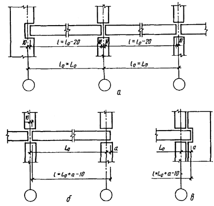 3.3. Форма и размеры плит должны соответствовать установленным рабочими чертежами на эти плиты. 3.4. Конструктивную длину и ширину плиты принимают согласно ГОСТ 28984 равными соответствующему координационному размеру плиты, уменьшенному на зазор между смежными плитами. При разработке рабочих чертежей плит массового применения зазор между смежными плитами следует принимать равным 20 мм (рисунок 1а). В случае необходимости перекрытия плитой пространства, превышающего расстояние между соседними координационными осями здания, конструктивную длину плит (например, плит, опираемых на стены лестничной клетки крупнопанельных зданий с поперечными несущими стенами) принимают равной расстоянию между осями, увеличенному на необходимую величину а, определяемую в соответствии с принятым конструктивным решением (рисунок 1б, 1в). 3.5. Координационную длину и ширину плит при разработке новых проектов жилых крупнопанельных зданий рекомендуется принимать в соответствии с таблицей 2 с учетом максимальной грузоподъемности монтажных кранов. lо - координационная длина плиты; l - конструктивная длина плиты; Lо - расстояние между поперечными координационными осями здания; а - привязка боковой грани плиты к координационной оси Рисунок 1 3.6. Рабочие чертежи плит массового применения рекомендуется разрабатывать на следующие расчетные нагрузки (без учета собственного веса плиты): 2,0; 3,0; 4,5; 6,0 кПа. 3.7. Плиты длиной более 4789 мм, предназначенные для опирания по двум сторонам и изготовляемые в горизонтальном положении, рекомендуется предусматривать предварительно напряженными. 3.8. Выбор типов плит производят в соответствии с приведенной в приложении А областью их применения в зависимости от требуемых значений индекса изоляции воздушного шума и приведенного уровня ударного шума под плитой и с учетом максимального шага поперечных несущих стен и применяемой конструкции пола. 3.9. Боковые грани плит всех типов могут иметь технологические скосы. Таблица 2