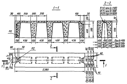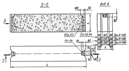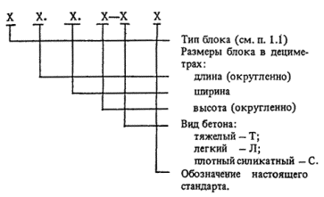 Пример условного обозначения блока типа ФБС, длиной 2380 мм, шириной 400 мм и высотой 580 мм, из тяжелого бетона: ФБС24.4.6-Т ГОСТ 13579-78 То же, типа ФБВ, длиной 880 мм, шириной 400 мм и высотой 580 мм, из легкого бетона: ФБВ9.4.6-Л ГОСТ 13579-78 То же, типа ФБП, длиной 2380 мм, шириной 500 мм и высотой 580 мм, из плотного силикатного бетона: ФБП24.5.6 -С ГОСТ 13579-78 1.4. Марки и характеристики блоков из тяжелого бетона приведены в табл. 2, из легкого бетона - в табл. 3, из плотного силикатного бетона - в табл. 4. При соответствующем обосновании допускается применение блоков из бетонов классов по прочности на сжатие, отличающихся от указанных в табл. 2 - 4. При этом во всех случаях класс бетона по прочности на сжатие должен приниматься не более В15 и не менее: В3,5 - для блоков из тяжелого и легкого бетонов; В12,5 - для блоков из плотного силикатного бетона. Примечание. В условное обозначение блоков из бетонов классов по прочности на сжатие, отличающихся от указанных в табл. 2 - 4, следует вводить соответствующий цифровой индекс перед буквой, характеризующей вид бетона. 1.5. Расположение монтажных петель в блоках должно соответствовать указанному на черт. 1 - 3. Конструкции монтажных петель приведены в приложении. Допускается устанавливать монтажные петли в блоках типа ФБС длиной 1180 и 2380 мм на расстоянии 300 мм от торцов блока и заподлицо с его верхней плоскостью. 1.3 - 1.5. (Измененная редакция, Изм. № 1).
