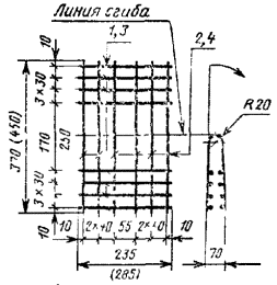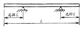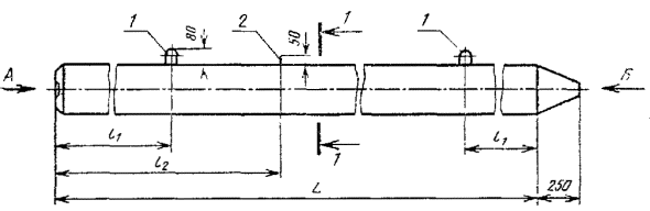 = RаII –300 - где: RаII - расчетное сопротивление арматуры растяжению для предельных состояний второй группы; l - длина натягиваемого стержня. (Измененная редакция, Изм. № 1). 2.9. Прочность бетона в момент отпуска натяжения арматуры (передаточная прочность) должна быть не ниже 200 кгс/см2. 2.10. После отпуска натяжения арматура должна быть срезана заподлицо с бетоном острия и в углублении торца сваи. 2.11. Усилие натяжения арматуры для каждой марки свай указано в табл. 1 приложения 1. 2.12. Диаметр продольной арматуры должен соответствовать приведенному в табл. 1 приложения 1. 2.13. Расстояние между осями проволок должно быть не менее 15 мм. Максимальное расстояние от центра тяжести поперечного сечения сваи до оси наиболее удаленной проволоки не должно превышать 25 мм. Расстояние между осями канатов должно быть не менее диаметра каната, но не более 50 мм. 2.14. Голова сваи должна быть усилена сетками из проволоки класса B-I или Вр-I диаметром 5 мм по ГОСТ 6727-80. Сетки устанавливаются попарно, количество сеток определяется в зависимости от длины сваи в соответствии с табл. 2 приложения 1. (Измененная редакция, Изм. № 1). 2.15. Острие сваи должно быть усилено спиралью из проволоки класса B-I диаметром 5 мм по ГОСТ 6727-80. 2.16. Петли для подъема свай, штыри и спираль в острие сваи должны быть привязаны к продольной арматуре сваи вязальной проволокой. 2.17. Для петель следует применять горячекатаную арматурную сталь класса A-I марок ВСт3сп2 и ВСт3пс2. В случае транспортирования свай при температуре – 40°С и ниже не допускается применять сталь марки ВСт3пс2. 3. ИСПЫТАНИЕ СВАЙ НА ОБРАЗОВАНИЕ ТРЕЩИН3.1. В соответствии с ГОСТ 19804.0-78 сваи должны быть испытаны на образование трещин путем укладки их на две опоры согласно черт. 2. Схема испытаний свай Черт. 2 3.2. После укладки свай на две опоры производят тщательный осмотр ее верхней грани над опорами. Сваю считают выдержавшей испытание, если на ее гранях не появятся трещины. ПРИЛОЖЕНИЕ 1АРМИРОВАНИЕ ЗАБИВНЫХ ЖЕЛЕЗОБЕТОННЫХ СВАЙ БЕЗ ПОПЕРЕЧНОГО АРМИРОВАНИЯ СТВОЛАПри армировании свай должны выполняться следующие требования 1. Схема армирования забивных железобетонных свай без поперечного армирования ствола должна соответствовать приведенной на чертеже настоящего приложения Количество сеток в голове сваи показано условно. Опалубочные размеры свай приведены в таблице настоящего стандарта. 2. Спецификация арматурных изделий на сваи должна соответствовать приведенной и табл. 1 настоящего приложения. 3. Выборка стали на сваи при различных вариантах продольного армирования приведена в табл. 2 настоящего приложения. 4. Чертежи арматурных изделий, ведомость стержней на каждый элемент арматурных изделий и выборка стали приведены в табл. 3 и 4 настоящего приложения. 1.-4. (Именная редакция, Изм. № l). Схема армирования свай