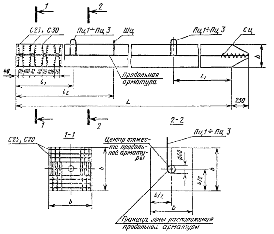 Постановлением Государственного комитета Совета Министров СССР по делам строительства от 30 декабря 1977 г. № 231 срок введения установлен с 01.01.79 Несоблюдение стандарта преследуется по закону Настоящий стандарт распространяется на забивные железобетонные сваи квадратного сечения без поперечного армирования ствола с напрягаемой арматурой, располагаемой в центре сечения сваи. Сваи, предусмотренные настоящим стандартом, рассчитаны на изгиб по прочности и образованию трещин от усилий, возникающих при подъеме на копер за одну точку, расположенную от торца на расстоянии, равном 0,294 длины призматической части сваи. Коэффициент динамичности к собственной массе принят равным 1,5, при этом коэффициент перегрузки к собственной массе не вводится. При проектировании свайных фундаментов сваи должны быть также проверены на прочность и образование трещин на нагрузки, возникающие при строительстве и эксплуатации здания или сооружения. При проверке сваи на прочность и образование трещин при внецентренном сжатии от эксплуатационных нагрузок допускается пользоваться графиками 1-8, приведенными в приложении 3. (Измененная редакция, Изм. № 1). 1. МАРКИ И ОСНОВНЫЕ РАЗМЕРЫ1.1. Форма свай должна соответствовать указанной на черт. 1, марка свай, основные размеры, объем бетона и справочная масса - указанным в таблице. (Измененная редакция, Изм. № 1). 1.2. Сваи длиной до 7 м включительно допускается изготовлять без штырей, при этом строповка свай при подъеме на копер должна осуществляться у верхней подъемной петли. 1.3. Центр тяжести продольной напрягаемой арматуры должен быть расположен в центре тяжести поперечного сечения свай. 1.4. Допускается изготовлять сваи с технологическим уклоном двух противоположных сторон поперечного сечения, не превышающим 1:20, без изменения площади поперечного сечения. Пример формы сваи с технологическим уклоном 1:20 приведен в приложении 2. Сваи квадратного сечения без поперечного армирования ствола