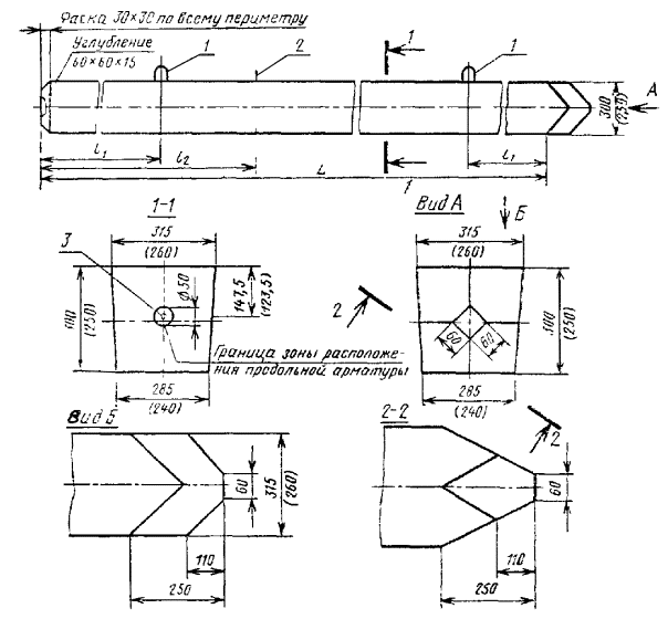 ПРИЛОЖЕНИЕ 2ЗАБИВНЫЕ ЖЕЛЕЗОБЕТОННЫЕ СВАИ БЕЗ ПОПЕРЕЧНОГО АРМИРОВАНИЯ СТВОЛА С ТЕХНОЛОГИЧЕСКИМ УКЛОНОМ 1: 20При изготовлении свай с технологическим уклоном двух противоположных сторон необходимо выполнить следующие требования. 1. Форма забивных железобетонных свай без поперечного армирования ствола с технологическим уклоном двух противоположных сторон, равном 1:20, должна соответствовать чертежу настоящего приложения. 2. Схема армирования сваи должна быть принята в соответствии с приложением 1. Сваи квадратного сечения без поперечного армирования ствола с технологическим уклоном двух противоположных сторон