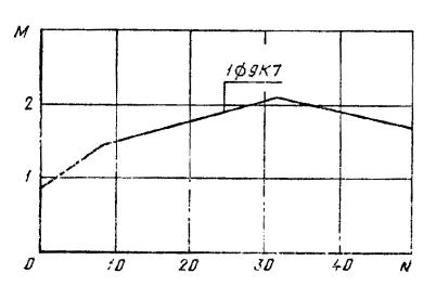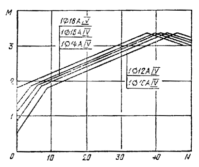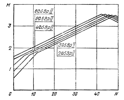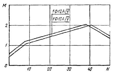 1 - подъемные петли; 2 - штырь для фиксации места строповки; 3 - продольная арматура. Примечание. Размеры L, l1,l2 приведены в таблице настоящего стандарта. ПРИЛОЖЕНИЕ 3ГРАФИКИ ДЛЯ ПРОВЕРКИ СВАЙ НА ПРОЧНОСТЬ И ОБРАЗОВАНИЕ ТРЕЩИН ПРИ ВНЕЦЕНТРЕННОМ СЖАТИИ ОТ ЭКСПЛУАТАЦИОННЫХ НАГРУЗОК1. Принцип построения графиков 1.1. Графики для проверки свай, приведенных в настоящем стандарте, на прочность на образование трещин при внецентренном сжатии от эксплуатационных нагрузок М, N приведены на черт 1-8 настоящего приложения. (Измененная редакция, Изм. № 1). 1.2. Предполагается, что сваи по всей длине находятся в грунте и коэффициент продольного изгиба сваи равен единице. 2. Порядок пользования графиками 2.1. После выбора длины сваи (по геологическим условиям) устанавливается продольное армирование сваи по табл. 1 приложения 1. 2.2. Если точка с координатами М и N лежит ниже прямой, соответствующей принятому армированию сваи, то выбранная свая удовлетворяет расчету по прочности и образованию трещин на эксплуатационные нагрузки М и N. если точка лежит выше -не удовлетворяет. 2.3. На графиках приняты обозначения: N - нормальная сила, тс, М - изгибающий момент относительно оси свай, тс. м, передаваемые на сваи при эксплуатации здания и сооружения. (Введен дополнительно, Изм. № 1). Сваи сечением 25´25 см Черт. 1 Сваи сечением 30´30 см