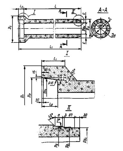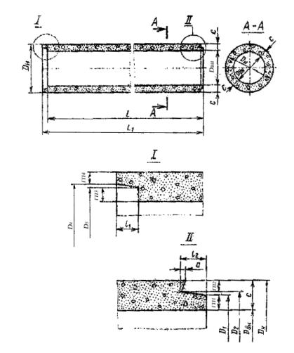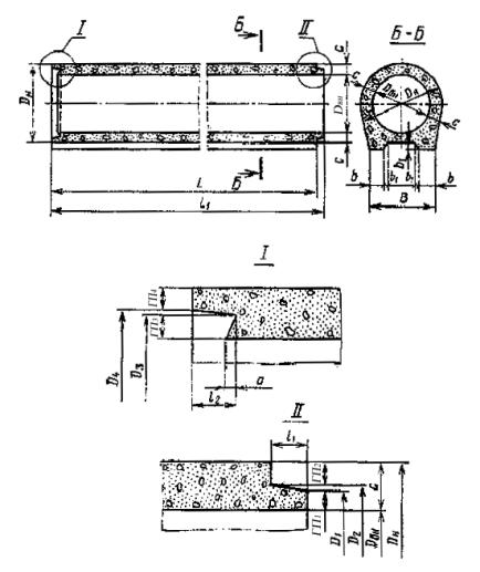 Постановлением Государственного комитета СССР по делам строительства от 12 марта 1982 г. № 48 срок введения установлен с 01.01 1983 г. Несоблюдение стандарта преследуется по закону Настоящий стандарт распространяется на бетонные безнапорные раструбные и фальцевые трубы с круглым отверстием, изготовляемые из тяжелого бетона и предназначенные для строительства в любых климатических условиях, а также при сейсмичности района строительства до 7 баллов включительно, подземных трубопроводов, по которым предусматривается транспортирование всех видов сточных вод самотеком. Трубы, предназначаемые для эксплуатации в условиях воздействия агрессивной среды, должны удовлетворять дополнительным требованиям, установленным в проекте трубопровода согласно главе СНиП II-28-73. Изготовление труб из мелкозернистого бетона в соответствии с требованиями настоящего стандарта допускается только при соответствующем технико-экономическом обосновании. Стандарт не распространяется на звенья бетонных водопропускных труб, укладываемых под насыпи железных и автомобильных дорог. 1. ТИПЫ, ОСНОВНЫЕ ПАРАМЕТРЫ И РАЗМЕРЫ1.1. Трубы подразделяют на следующие типы: ТБ - раструбные цилиндрические со стыковыми соединениями, уплотняемыми герметиками или другими материалами; ТБС - раструбные цилиндрические со ступенчатой стыковой поверхностью втулочного конца трубы, стыковые соединения которых уплотняются резиновыми кольцами; ТБПС - тоже, с подошвой; ТБФ - фальцевые цилиндрические со стыковыми соединениями, уплотняемыми герметиками или другими материалами; ТБПФ - тоже, с подошвой. Трубы высшей категории качества могут быть: всех типов - при диаметре менее 400 мм, только типов ТБС и ТБПС - при диаметре 400 мм и более. 1.2. Форма и размеры труб в зависимости от значений внутреннего диаметра должны соответствовать: типа ТБ указанным на черт. 1 и в табл. 1 Примечания: 1. Допускается изготовлять трубы всех типов большей полезной длины, чем указано в табл. 1-5. При этом полезная длина труб (L) должна быть кратной 500 мм. 2. Допускается до 1 января 1986 г. изготавливать на действующем оборудовании трубы с размерами, отличными от указанных в табл. 1-5, при условии соблюдения всех остальных требований, установленных настоящим стандартом. 1.3. Трубы в зависимости от их прочности подразделяют по несущей способности на две группы: 1 - трубы нормальной прочности; 2 - трубы повышенной прочности. 1.4. Трубы обозначают марками в соответствии с ГОСТ 23009-78. Марка труб состоит из буквенно-цифровых групп, разделенных дефисами. Первая группа марки содержит обозначение типа трубы и номинальные габаритные размеры: диаметр условного прохода в сантиметрах и полезную длину в дециметрах. Во второй группе марки указывают группу по несущей способности. В третью группу марки включают обозначения дополнительных характеристик, отражающих условия эксплуатации труб. Например для труб, применяемых в условиях воздействия агрессивных сред, - характеристики степени плотности бетона (Н - нормальная плотность, П - повышенная плотность, О - особоплотный) и вид агрессии (Щ - щелочная, К - кислотная и др.). Пример условного обозначения (марки) трубы типа ТБ диаметром условного прохода 600 мм, полезной длиной 2000 мм, 2-й группы по несущей способности, предназначенной для эксплуатации в обычных условиях: ТБ 60.20-2 То же, трубы типа ТБС ди