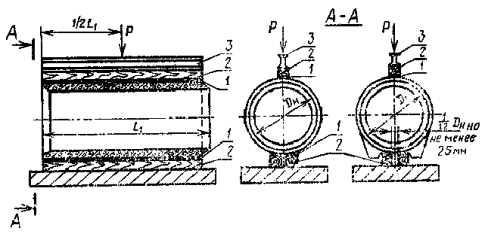 3. КОМПЛЕКТНОСТЬ3.1. Предприятия-изготовители труб должны поставлять потребителям трубы типов ТБС и ТБПС, предназначаемые для эксплуатации в условиях неагрессивной и слабоагрессивной сред, в комплекте с резиновыми уплотняющими кольцами по ГОСТ 22000-76. 4. ПРАВИЛА ПРИЕМКИ4.1. Приемку труб следует производить партиями в соответствии с требованиями ГОСТ 13015.1-81 и настоящего стандарта в зависимости от специфики конкретного производства. 4.2. Испытания бетона труб следует производить не реже: на водонепроницаемость - одного раза в три месяца, на морозостойкость, а также водопоглощение (в случаях, предусмотренных п. 2.6.6 настоящего стандарта) - одного раза в шесть месяцев. 4.3. Испытания труб по водонепроницаемости следует производить не реже одного раза в две недели путем испытания двух труб, (для труб высшей категории качества - четырех труб) от следующего количества изготовленных труб: 1000 шт. - диаметром 100-200 мм; 500 шт. - диаметром 300-600 мм; 200 шт. - диаметром 800, 1000 мм. Трубы считают выдержавшими испытание на водонепроницаемость, если после выдержки в них воды под давлением в соответствии с п. 5.2.2. на наружной поверхности трубы не будет обнаружено просачивание воды в виде отдельных капель или течи. Появление сырых пятен на наружной поверхности трубы, испытываемой на водонепроницаемость, не может служить основанием для браковки трубы. В случае неудовлетворительных результатов испытания труб по водонепроницаемости проводят испытания удвоенного количества труб, не подвергавшихся испытаниям. Если при повторной проверке хотя бы одна труба не будет удовлетворять требованиям настоящего стандарта, то трубы следует принимать поштучно. 4.4. Приемка труб по прочности 4.4.1. Испытания труб по прочности следует производить не реже одного раза в две недели путем нагружения двух труб от следующего количества изготавливаемых труб: 1000 шт. - диаметром 100-200 мм; 500 шт. - диаметром 300-600 мм; 200 шт. - диаметром 800, 1000 мм. 4.4.2. Оценка прочности труб - по ГОСТ 8829-77. При этом контрольную нагрузку следует принимать по табл. 6 настоящего стандарта. 4.4.3. Если трубы 2-й группы по несущей способности по результатам испытаний на прочность не удовлетворяют требованиям, приведенным в табл. 6, то они подвергаются испытанию по показателям 1-й группы по несущей способности. Использование труб, не выдержавших по результатам испытаний требований по прочности, установленных для изделий первой группы, - по ГОСТ 8829-77. Трубы, переведенные по результатам испытаний из одной группы в другую, аттестации по высшей категории качества не подлежат. 5. МЕТОДЫ КОНТРОЛЯ И ИСПЫТАНИЙ5.1. Испытания труб по прочности 5.1.1. Контроль прочности труб следует проводить нагружением по ГОСТ 8829-77. 5.1.2. Испытания труб по прочности проводят при положительной температуре воздуха и испытываемой трубы после достижения бетоном проектной марки по прочности на осевое растяжение. 5.1.3. Испытанию нагружением подвергают целую трубу или отрезок трубы длиной не менее 1 м. Допускается использовать для испытания нагружением трубы, прошедшие гидростатические испытания на водонепроницаемость. 5.1.4. Схемы опирания и загружения труб при испытании их по прочности приведены на черт. 6 и 7, а значения контрольных нагрузок в табл. 6 настоящего стандарта. 5.1.5. Испытания труб по прочности проводят в следующем порядке. Трубу устанавливают горизонта
