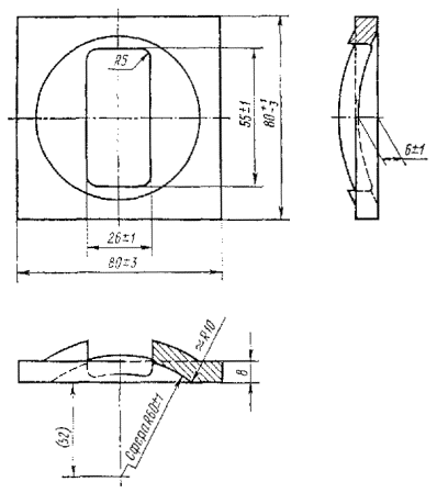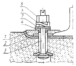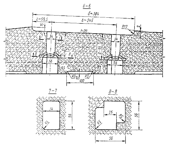 Расположение арматурных проволок в шпалах должно соответствовать указанному на черт. 4. 2.8. Общее усилие контролируемого предварительного напряжения арматуры шпалы должно быть не менее указанного в табл. 1. Величина контролируемого предварительного напряжения отдельных проволок при проектном армировании не должна отличаться от указанной в табл. 1 более чем на 10%. При натяжении арматуры допускается обрыв или проскальзывание в захватах с полной потерей предварительного натяжения не более двух проволок диаметром 3 мм или одной проволоки диаметром 5 мм при условии, что общее усилие предварительного напряжения оставшихся проволок будет не менее величины, указанной в табл. 1. 2.9. Опорные шайбы, служащие для удержания закладных болтов рельсового скрепления, должны изготовляться из сталей марки 15ХСНД или 15ХГ2СФМР. Форма и размеры шайб должны соответствовать указанным на черт. 5. Схема установки на шпале скрепления типа ЛС-053 показана на черт. 6. Примечание. По согласованию с потребителем допускается изготовлять шпалы без металлических закладных шайб, с гнездами для размещения съемных пластмассовых вкладышей для закладных болтов. 2.10. Отклонения от проектных размеров шпал не должны превышать следующих величин в мм: по длине................................................................................................................................ ±16 по ширине................................................................................................................................ ±8 по высоте................................................................................................................................ +10; -3 по разности высот шпалы, измеренной в одном поперечном сечении................................................................................................................................ 8 по расстоянию а между наружными кромками углубления в подрельсовых площадках разных концов шпалы................................................................................................................................ ±2 по расстоянию б между кромками углублений в подрельсовой площадке одного конца шпалы................................................................................................................................ +3; -1 по расстоянию в и г между осями отверстий закладных болтов и наружной кромкой углубления в подрельсовой площадке одного конца шпалы................................................................................................................................ ±2 по глубине д заделки в бетон закладных шайб................................................................................................................................ ±5 по поперечным размерам отверстий для закладного болта................................................................................................................................ +5; -2 по толщине защитного слоя бетона над верхним рядом напряженной арматуры и расстоянию по вертикали от каждого ряда проволок до верхней кромки торца шпалы................................................................................................................................ +8; -3 Примечание. Размеры а, б, в, г, д указаны на черт. 1-4. 2.11. Подуклонка подрельсовых площадок должна быть равной 1 : 20. Допускается отклонение величины подуклонки в пределах 1 : 19 - 1 : 22. 2.12. Угол взаимного поворота подрельсовых площадок разных концов шпалы относительно ее продольной оси («пропеллерность») не должен превышать 0,015 рад. Шайба опорная Черт. 5 Схема установки скрепления типа ЛС-053 1 - прижимная клемма; 2 - резиновая прокладка; 3 - болт М22´175-01 ГОСТ 16017-79; 4 - текстолитовая втулка ВИ-22-00; 5 - двухвитковая или трехвитковая пружинная шайба; 6 - гайка М22´22-01 ГОСТ 16018-79; 7 - шайба 25. Черт. 6 2.13. В шпалах не допускаются: а) трещины, за исключением усадочных поверхностных; б) об
