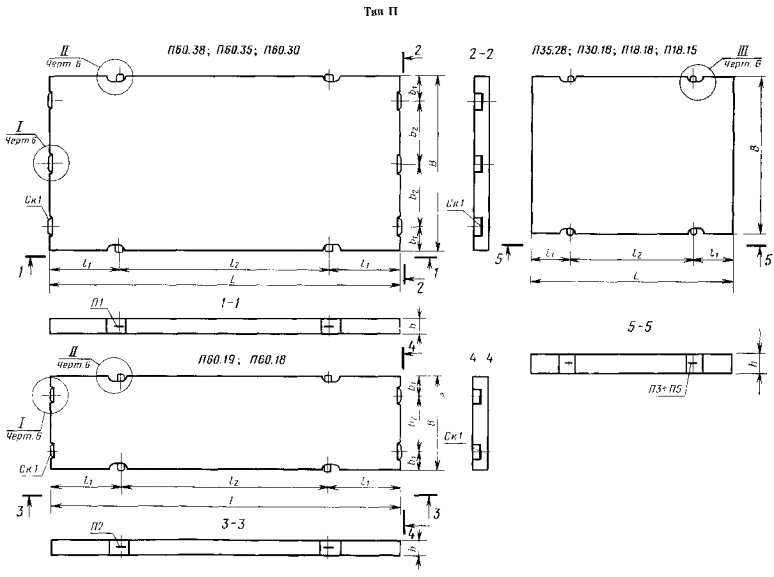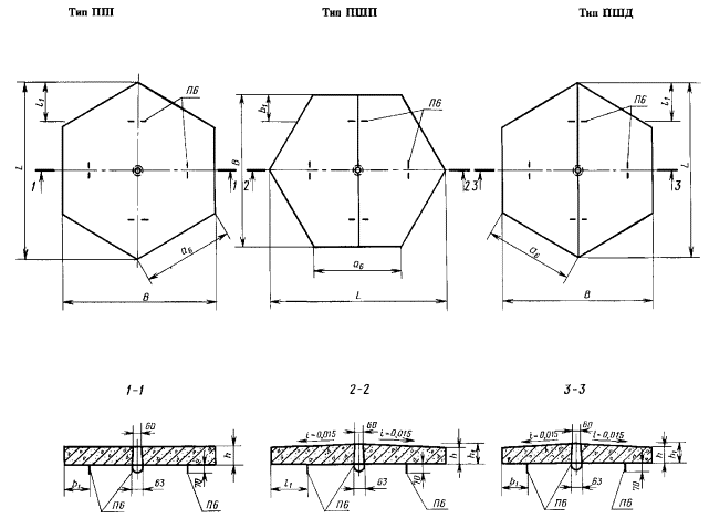 Дата введения 01.01.85 Настоящий стандарт распространяется на железобетонные предварительно напряженные плиты и плиты с ненапрягаемой арматурой, изготовляемые из тяжелого бетона и предназначенные для устройства сборочных покрытий постоянных и временных городских дорог под автомобильную нагрузку Н-30 и Н-10. Плиты применяют для дорог в районах с расчетной температурой наружного воздуха (средней наиболее холодной пятидневки района строительства по СНиП 2.01.01) до минус 40 °C включ. При применении плит в климатическом подрайоне IVA должны учитываться дополнительные требования СНиП 2.03.01 к конструкциям, предназначенным для эксплуатации в этом районе. Допускается применение данных плит для дорог в районах с расчетной температурой наружного воздуха ниже минус 40 °C при соблюдении требований, предъявляемых СНиП 2.03.01 к конструкциям, предназначенным для эксплуатации в этих условиях. Стандарт не распространяется на железобетонные плиты для внутренних автомобильных дорог промышленных предприятий, для внутрихозяйственных автомобильных дорог по СНиП 2.05.07, а также на плиты многоразового использования для временных дорог на строительных площадках. (Измененная редакция, Изм. № 1). 1. ТИПЫ, ОСНОВНЫЕ ПАРАМЕТРЫ И РАЗМЕРЫ1.1. Плиты подразделяют на типы в зависимости: - от назначения: 1 - для постоянных дорог, 2 - для временных дорог; - от конфигурации: П - прямоугольная, ПБ - прямоугольная с одним совмещенным бортом, ПББ - прямоугольная с двумя совмещенными бортами, ПТ - трапецеидальная, ПШ - шестиугольная, ПШД - шестиугольная осевая диагональная, ПШП - шестиугольная осевая поперечная, ДПШ - диагональная половина шестиугольной плиты, ППШ - поперечная половина шестиугольной плиты. 1.2. Форма и основные размеры плит должны соответствовать указанным на черт 1-6 и в табл. 1, 2. Черт. 1