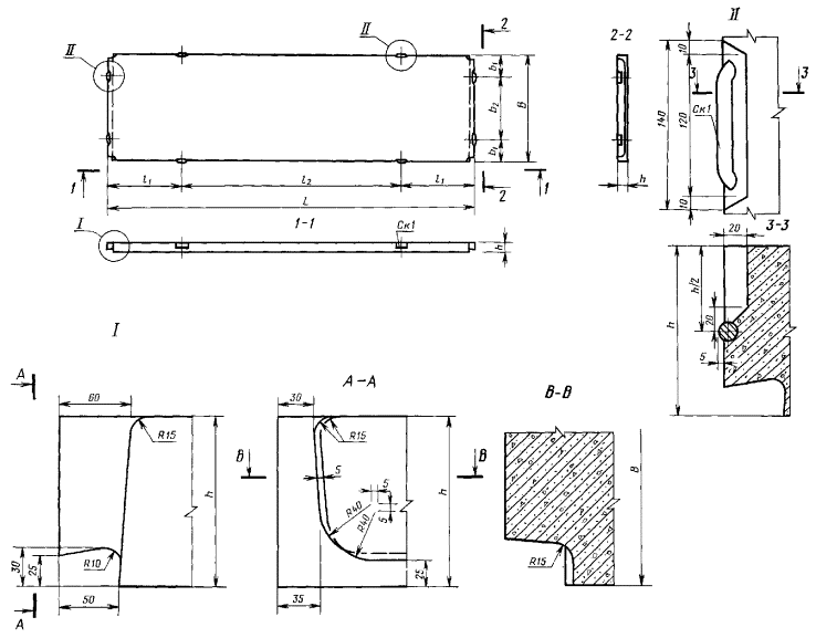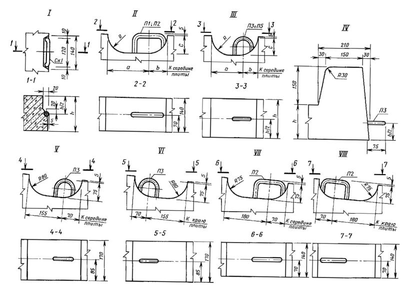 (Измененная редакция, Изм. № 1). Плиты для временных дорог изготовляют без монтажных скоб Ск1. В этих плитах ниши для монтажных скоб допускается не устраивать. По согласованию с потребителем допускается изготовление плит типов П и ПТ с пазами для беспетлевого монтажа в соответствии с черт. 7 или с отверстиями для цангового захвата вместо монтажных петель и устройства ниш для них. При этом в предварительно напряженных плитах для постоянных дорог взамен монтажных петель необходима установка скоб Ск1 в соответствии с черт. 6 (узел 1). Число отверстий для цанговых захватов и их расположение определяют исходя из технологии изготовления плит и их монтажа. Рабочая поверхность плит (верхняя поверхность дорожного покрытия) должна иметь рифление согласно черт. 8, а плит, изготовляемых этой поверхностью «вверх», должна быть шероховатой (п. 2.9.1). Примечания: 1. Допускается изготовление плит с фаской размером не более 10 мм на лицевой поверхности плиты. 2. Допускается изготовление плит с технологическими скосами в местах установки монтажных петель и скоб не более 5 мм, а также с технологическими нишами под скобами Ск1 глубиной 20 мм. 3. Инвентарные плиты для временных дорог допускается изготовлять с технологическими скосами не более 8 мм. 4. Допускается изготовление на действующем оборудовании плит общим видом, отличным от указанного на черт. 1 - 8, при сохранении габаритных размеров плиты и соблюдении всех остальных требований, установленных настоящим стандартом. 5. Для беспетлевых плит (черт. 7) допускаются изменения формы плит, связанные с технологией их изготовления (наличие и размеры фасок, радиусов закруглений и т.д.). 6. Для плит с ненапрягаемой арматурой допускается вертикальное расположение монтажных петель. 7. Допускается смещение монтажных петель в пределах ниш от середины плиты вдоль ее грани до положения зеркально заменяемым привязкам петель (размеры а и b) по черт. 6. 1.3. Плиты рассчитаны на проезд автомобилей массой 30 и 10 т. При этом коэффициент динамичности принят равным 1,2, а модуль деформации основания при расчете плит составляет: - для постоянных дорог - 50 МПа (500 кгс/см2); - для временных дорог - 25 МПа (250 кгс/см2). 1.4. Конструкция плит приведена: - предварительно напряженных плит - в ГОСТ 21924.1; - плит с ненапрягаемой арматурой - в ГОСТ 21924.2. 1.5. Плиты изготовляют с монтажными петлями и отверстиями для цангового захвата (черт. 1 - 6) или пазами для беспетлевого монтажа (черт. 7). Петли не должны выступать за рабочую поверхность грани плиты. Для подъема и монтажа беспетлевых плит следует применять специальные захватные устройства или цанговые захваты, конструкцию которых принимает изготовитель по согласованию с потребителем и Госгортехнадзором. 1.6. Плиты обозначают марками в соответствии с ГОСТ 23009. Марка плиты состоит из буквенно-цифровых групп, разделенных дефисом. Первая группа содержит обозначение типа плиты (п. 1.1) и ее номинальные размеры в дециметрах (с округлением значений до целого числа): - для прямоугольных плит - длину и ширину; - для трапецеидальных плит - длину; - для шестиугольных плит - диагональ. Во второй группе приводят значение нагрузки, на которую рассчитана плита (п. 1.3). Для предварительно напряженных плит во второй группе марки приводят также класс напрягаемой арматурной стали. Марку плит, изготовляемых с пазами для беспетлевого монт
