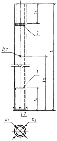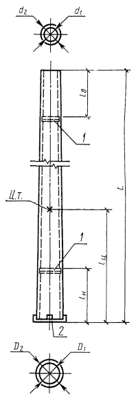 1 - опорные диафрагмы; 2 - подпятник; 3 - коротыши; 4 - цементный раствор; ц.т. - центр тяжести стойки; L - длина стойки; lц - расстояние до центра тяжести стойки; lн, lв - расстояния до мест установки опорных диафрагм; D2, d2 - наружные диаметры стойки; D1, d1 - внутренние диаметры стойки; 5 - асбестовый лист D = 410 mm, d = 10 мм.