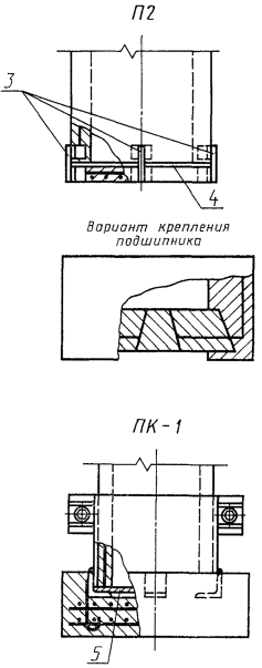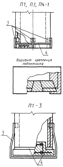 Крепление подпятников, изготовляемых отдельно (П1-П3, ПК-3) и совместно со стойками, приведено на черт. 1-2.
