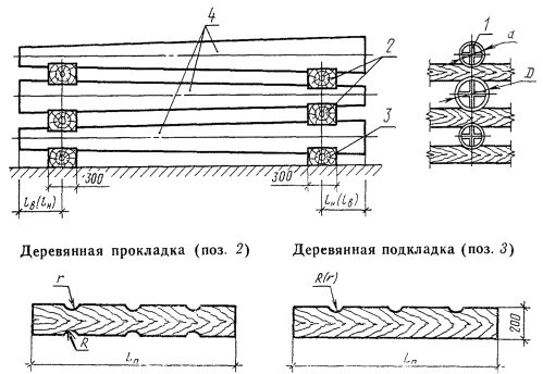 Концевые участки подкладок и прокладок должны быть D/2 + 200 мм. Наряду с деревянными допускается применение подкладок и прокладок из других материалов (с установкой деревянных или резиновых амортизаторов для предохранения стоек от повреждений в местах их опирания).