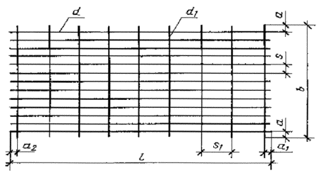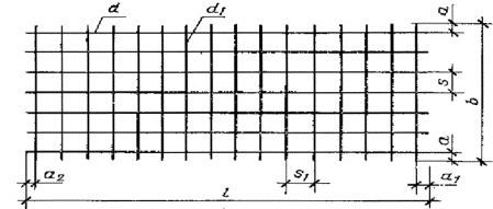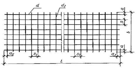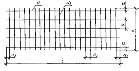 где а1, а2 - значения выпусков продольных стержней (при а1 = а2 приводят только одно значение в миллиметрах); а - значение выпусков поперечных стержней в миллиметрах. Примеры условных обозначений: тяжелой сетки типа 1 с продольными стержнями из арматурной стали класса А-III диаметром 25 мм, с шагом 200 мм и с поперечными стержнями из арматурной стали класса А-III диаметром 10 мм, с шагом 600 мм, шириной 2050 мм и длиной 6650 мм, с выпусками продольных и поперечных стержней 25 мм: