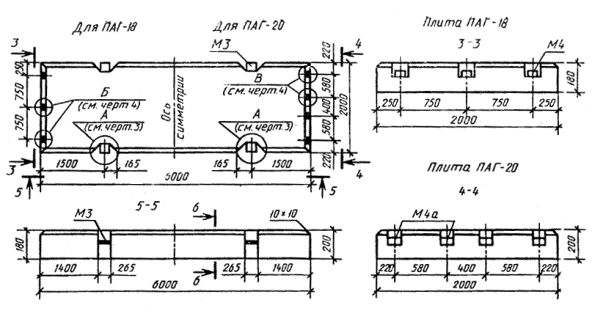 Дата введения 01.01.92 Настоящий стандарт распространяется на предварительно напряженные железобетонные плиты ПАГ размерами 6´2 м, изготовляемые из тяжелого бетона и предназначенные для устройства сборных аэродромных покрытий. 1. ТЕХНИЧЕСКИЕ ТРЕБОВАНИЯ1.1. Плиты изготовляют в соответствии с требованиями настоящего стандарта и утвержденной в установленном порядке технологической документации, содержащей требования к изготовлению плит на всех стадиях производственного процесса, по чертежам, приведенным в ГОСТ 25912.1 - ГОСТ 25912.3. 1.2. Плиты подлежат изготовлению в формах, обеспечивающих соблюдение установленных настоящим стандартом требований к качеству и точности изготовления плит. 1.3. Основные параметры и размеры 1.3.1. В зависимости от толщины плиты подразделяют на ПАГ-14, ПАГ-18 и ПАГ-20. 1.3.2. Форма и основные размеры плит должны соответствовать указанным на черт. 1 - 4. Примечания: 1. На продольных гранях плит допускается устройство углублений размерами 20´100´200 мм для обеспечения возможности подъема плит с применением автоматических захватов. 2. В плитах с наклонными продольными гранями монтажно-стыковые изделия М1 или М3 (черт. 1 и 3) устанавливают заподлицо с плоскостью, определяющей габаритный размер ширины плиты, - 2000 мм. Плита ПАГ-14