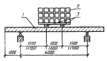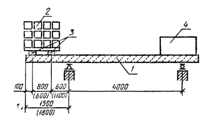 1 - испытуемая плита; 2 - нагрузка на всю ширину плиты; 3 - деревянные брусья сечением 10´10 см; 4 - пригрузочный балласт Примечание. Размеры в скобках относятся к схемам испытания плит ПАГ-18 и ПАГ-20. Черт. 6 3.8.1. Испытание плит по трещиностойкости нижней зоны следует проводить по схеме А, приведенной на черт. 6. Испытание плит по трещиностойкости верхней зоны проводят по схеме А или Б, приведенным на черт. 6. 3.8.2. Испытание плит после термообработки (с отпускной прочностью бетона) следует проводить не ранее 4 ч и не позднее 2 сут. 3.8.3. Вначале проводят испытание плиты по трещиностойкости нижней зоны, а затем испытание этой же плиты по трещиностойкости верхней зоны. При испытании плиты по трещиностойкости верхней зоны по схеме А, приведенной на черт. 6, плиту после испытания нижней зоны кантуют. Загружение плиты при испытании проводят ступенями. Доля нагрузки каждой ступени должна составлять не более 10 % контрольной нагрузки, а двух последних ступеней - не более 5 %. После приложения каждой ступени контрольной нагрузки плиту выдерживают под нагрузкой не менее 10 мин, а после приложения полной контрольной нагрузки - не менее 30 мин. 3.8.4. Значения контрольной нагрузки по испытанию трещиностойкости плиты приведены в табл. 3. Таблица 3