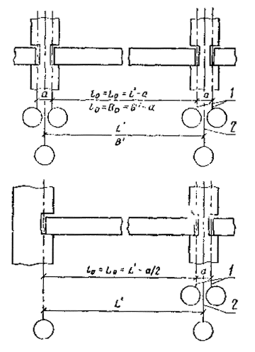 1 - координационные оси здания; 2 - разбивочная ось здания; l0 - координационная длина плиты; L0 и B0 - расстояние соответственно между поперечными и продольными координационными осями здания; L' и В' - расстояние соответственно между поперечными и продольными разбивочными осями здания; а - расстояние между парными координационными осями Черт. 2 Таблица 2