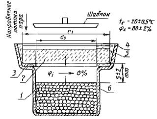 2.2.3. Испытуемую поверхность образцов, получаемых из строительной конструкции, оставляют без изменений. Поверхность образцов, получаемых из бетонных кубов или цилиндров, перед испытанием очищают от цементной пленки и шлифуют плоскопараллельно. 2.2.4. Испытание проводят на пяти образцах с защитным покрытием и на пяти образцах без покрытия. Поверхность образца обеспыливают. Нанесение защитного покрытия выполняют не ранее чем через 28 сут в соответствии с техническими требованиями для применения испытуемого покрытия. 2.2.5. Толщину образца измеряют в пяти точках с помощью штангенциркуля и определяют среднее арифметическое значение. Толщина образца с защитным покрытием включает в себя и толщину защитного покрытия. 2.2.6. По краю нижней поверхности образца приклеивают резиновое кольцо так, чтобы испытуемая поверхность без защитного покрытия не была запачкана клеем. Для испытаний применяют: 1) стеклянные или металлические сосуды (черт. 1, табл. 2); 2) круглые шаблоны диаметром d2; 3) шкаф для кондиционирования (изменение температуры в пределах ± 2 °С); 4) резиновые кольца согласно диаметрам, приведенным в табл. 2; 1 - влагопоглощающее вещество; 2 - образец; 3 - резиновое кольцо; 4 - герметизирующая паста; 5 - испытуемое покрытие; 6 - сосуд Черт. 1 Таблица 2 мм