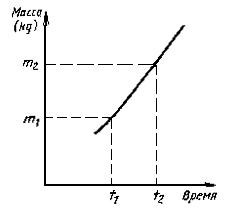 5) штангенциркуль; 6) весы с погрешностью взвешивания ± 11 мг; 7) металлические и волосяные щетки; 8) влагопоглощающее вещество - гранулированный хлористый кальций (обезвоженный) или силикагель (обезвоженный); 9) клей на основе эпоксидной смолы; 10) герметизирующую пасту, состав которой выбирается предпочтительно из следующих вариантов: макрокристаллический воск - 60 % и кристаллически чистый твердый парафин - 40 %; макрокристаллический воск - 90 % и пластификатор - 10 %; твердый парафин с точкой плавления от 50 до 52 °С - 80 % и клейкий полиизобутилен - 20 %; пчелиный воск или парафин - 60 % и канифоль - 40 %. 2.4. Проведение испытания 2.4.1. В сосуд закладывают влагопоглощающее вещество по черт. 1, зазор между образцом и стенкой сосуда заполняют герметизирующей пастой. Кольцеобразный край верхней поверхности образца покрывают герметизирующей пастой до размера, соответствующего открытой нижней поверхности образца. 2.4.2. Подготовленные к испытанию 10 сосудов с образцами взвешивают с точностью до ± 1 мг или ± 10 мг в зависимости от размеров образца и выдерживают в шкафу для кондиционирования при температуре (20 ± 0,5) °С и относительной влажности воздуха jе (80 ± 2) %. 2.4.3. Сосуды с образцами взвешивают каждые 24 ч и определяют количество водяного пара, прошедшего через образцы. 2.4.4. Взвешивания повторяют до тех пор, пока изменение массы за единицу времени не будет постоянным. Насыщение водой влагопоглощающего вещества не должно превышать 5 % исходного количества. При насыщении, превышающем 5 %, испытание образцов повторяют, причем сосуд наполняют новым количеством влагопоглощающего вещества. 2.4.5. Результаты измерений и взвешивания каждого образца записывают. 2.5. Обработка результатов испытания 2.5.1. По данным отдельных взвешиваний строят график зависимости изменения массы влагопоглощающего вещества от времени (черт. 2). Для определения коэффициента паропроницаемости используют данные взвешиваний после появления постоянного диффузионного потока, что на черт. 2 изображено в виде прямой линии. Черт. 2 2.5.2. Коэффициент паропроницаемости (dm), кг × м-2 с-1 Па-1, вычисляют для каждого образца по формуле