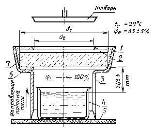 Протокол испытания должен содержать следующие данные: 1) наименование предприятия изготовителя и страны; 2) наименование и марку испытуемого продукта (описание строительной конструкции, из которой были получены образцы, вид защитного покрытия); 3) размеры образцов (диаметр, толщина, испытуемая площадь); 4) технологию и условия нанесения защитного покрытия (температура, относительная влажность воздуха, продолжительность сушки); 5) условия подготовки и проведения испытаний (температура) относительная влажность воздуха); 6) измеренные значения массы влагопоглощающего вещества; 7) отдельные и средние значения результатов испытаний на паропроницаемости покрытия; 8) дату и место проведения испытаний; 9) обозначение настоящего стандарта. 3. МОКРЫЙ МЕТОД ИСПЫТАНИЯ ПАРОПРОНИЦАЕМОСТИ3.1. Сущность метода Метод испытания заключается в определении количества водяного пара, пропускаемого образцами с защитным покрытием без него, или проходящего через нанесенное на стеклоткань защитное покрытие и последующего расчета сопротивления паропроницаемости защитного покрытия. 3.2. Отбор и подготовка образцов 3.2.1. В качестве образцов применяют бетонные диски диаметром (100 ± 1) мм. Толщина и изготовление образцов по п. 2.2. Для испытания паропроницаемости защитного покрытия не на бетонном основании защитное покрытие наносят на стеклоткань толщиной 0,5 мм, размером ячеек 0,5´0,5 мм. 3.2.2. Испытание проводится согласно п. 2.2.4. 3.3. Аппаратура и материалы Для испытания применяют: 1) обойму по черт. 3; 2) шаблоны диаметром d2; 3) испарительные стаканы с крышкой; 4) резиновые прокладки; 5) металлические кольца; 6) шкаф для кондиционирования (изменение температуры в пределах ± 2 °С); 7) резиновые кольца согласно диаметрам по табл. 2; 8) штангенциркуль; 9) весы с погрешностью взвешивания ± 1 мг; 10) клей на основе эпоксидной смолы; 11) герметизирующую пасту по п. 2.3; 12) дистиллированную воду; 13) нитрат аммония; 14) стеклоткань. 1 - герметизирующая паста; 2 - испытуемое покрытие; 3 - обойма; 4 - испытательный стакан с водой; 5 - резиновый коврик; 6 - резиновое кольцо; 7 - образец Черт. 3 3.4. Проведение испытания 3.4.1. Подготовку бетонных образцов к испытанию проводят по п. 2.2.1 и 2.2.2. Образцы вставляют в расширенную часть обоймы и герметизирующей пастой, как указано в п. 2.4.1, заделывают зазоры между образцами и краями обоймы по черт. 3. 3.4.2. Для испытания паропроницаемости защитного покрытия, наносимого на стеклоткань, стеклоткань защемляют между двумя металлическими кольцами и вставляют в расширенную часть обоймы. Затем на стеклоткань по п. 2.2.4 наносят защитное покрытие и сушат. Зазоры между обоймой и металлическими кольцами заделывают герметизирующей пастой. При этом испытуемое защитное покрытие следует закрыть шаблоном. 3.4.3. Подготовленные обоймы с образцами и испытательные стаканы с водой устанавливают на резиновой подкладке в шкафу для кондиционирования при температуре (20 ± 0,5) °С и относительной влажности воздуха je = (65 ± 5) %. Относительную влажность воздуха регулируют с помощью насыщенного раствора нитрата аммония. Принципиальная схема комплектного устройства испытания показана на черт. 3. 3.4.4. Испытательные стаканы с водой взвешивают с закрытой крышкой с точностью до ± 1 мг. Взвешивание повторяется каждые 24 ч до тех пор, пока масса не станет постоянной. 3.4.5. Через 10 дней доливают воду в испытательные с