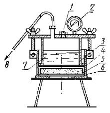 где t - продолжительность прохождения постоянного потока пара, с; т - общая масса водяного пара, проходящего через защитное покрытие за время t, кг; hc - толщина защитного покрытия, м. За среднее значение количества водяного пара, проходящего через образец m1 и т2, принимают среднее арифметическое четырех параллельных определений, расхождения между которыми не превышают 10 %. 3.6. Протокол испытания Протокол испытания должен содержать данные, указанные в п. 2.6, а также: 1) измеренные значения массы испарившейся воды т1 и m2; 2) отдельные и средние значения сопротивления паропроницаемости покрытия Rw или rw. ПРИЛОЖЕНИЕСправочное 1. Для изготовления образцов для испытания водопроницаемости приемлема следующая рецептура: портландцемент 35 - 400 кг; плотный естественный заполнитель - 1400 кг; с гранулометрическим составом, %: от 0 до 0,20 мм - 10; от 0,21 до 0,80 мм - 20; от 0,81 до 2,00 мм - 30; от 2;01 до 5,00 мм - 40; водоцементное отношение 0,60. 2. Принципиальная схема аппаратуры для определения водопроницаемости покрытий (черт. 4). 1 - входное отверстие для воды; 2 - манометр; 3 - уплотняющая прокладка (резиновая); 4 - испытываемое покрытие; 5 - цементно-песчаный образец; 6 - металлическое кольцо; 7 - вода; 8 - к баллону со сжатым воздухом Черт. 4 ИНФОРМАЦИОННЫЕ ДАННЫЕ 1. РАЗРАБОТАН И ВНЕСЕН Научно-исследовательским, проектно-конструкторским и технологическим институтом бетона и железобетона Госстроя СССР РАЗРАБОТЧИКИ Ф.М. Иванов, д-р техн. наук; Е.А. Гузеев, д-р техн. наук 2. УТВЕРЖДЕН И ВВЕДЕН В ДЕЙСТВИЕ Постановлением Государственного строительного комитета СССР от 10.05.89 № 74. 3. Стандарт полностью соответствует СТ СЭВ 6320-88. 4. Введен впервые. СОДЕРЖАНИЕ