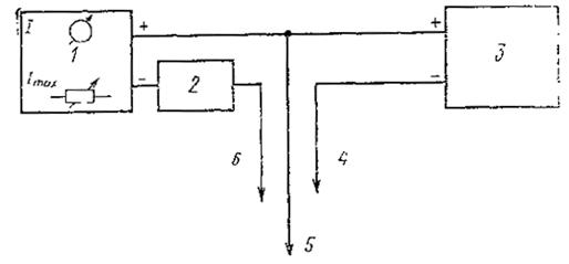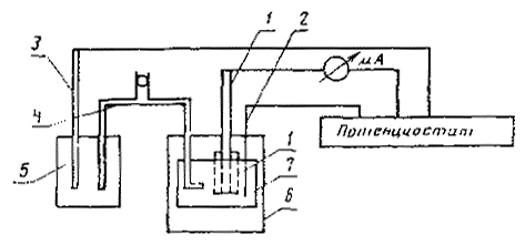 l - рабочий или испытуемый электрод (стальной стержень в водной вытяжке бетона или в бетонном образце - D), 2 - вспомогательный электрод (платиновый или титановый электрод); 3 - электрод сравнения (например насыщенный каломельный электрод); 4 - солевой проводник; 5 - термостатированный измерительный сосуд с насыщенным раствором хлористого калия, 6-термостат; 7 - водная вытяжка из бетона или дистиллированная вода Черт. 1 Принципиальная электрическая схема для измерения гальванодинамическим способом приведена на черт. 2.