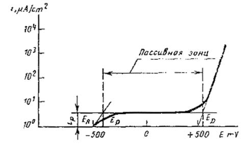 1 - генератор тока; 2 - кулонометр; 3 - компенсограф; 4 - электрод сравнений (каломельный); 5 - рабочий (испытуемый) электрод Fe; б - вспомогательный платиновый (титановый) электрод Черт. 2 5. ПРОВЕДЕНИЕ ИСПЫТАНИЙ5.1. Измерения электрохимических характеристик необходимо проводить при температуре фильтрата водной вытяжки из бетона (25±0,5) °С. 5.2. Образцы бетона с арматурой до начала измерений насыщают дистиллированной водой (при необходимости под вакуумом), а затем измеряют омическое сопротивление бетона при переменном токе для построения поляризационной кривой. 5.3. На каждом образце бетона и стальной арматуры следует выполнять только одно измерение. 5.4. Измерения величины силы тока в микроамперах потенциодинамическим способом производят в фильтрате водной вытяжки из бетона или в бетонном образце по истечении (60±5) min после включения потенциостата (черт. 1). После этого снимают анодную часть поляризационной кривой при прохождении диапазона от установившегося потенциала до плюс 1000 mV в течение 60 min. В случае снятия полной поляризационной кривой предварительно необходимо пройти катодный диапазон поляризации до минус 1000 mV и после этого снять характеристику поляризации на анодной части. В процессе снятия потенциодинамической характеристики в фильтрате водной вытяжки из бетона необходимо пройти весь диапазон поляризации от минус 1000 до плюс 1000 mV в течение 60 min. Если невозможна непрерывная запись в координатах Х - Y, то необходимо регистрировать величину силы тока через каждые 50 mV. 5.5. Измерения гальванодинамическим способом производят в фильтрате водной вытяжки из бетона или в бетонном образце путем регистрации величины потенциала в милливольтах с помощью компенсографа или вольтметра (черт. 2). Снятие гальванодинамических характеристик в фильтрате водной вытяжки из бетона или на бетонных образцах проводят со скоростью изменения плотности тока не менее 7mA/cm2 в минуту. Поляризация в водной вытяжке может производиться увеличением плотности тока до 50 mA/cm2, в бетонных образцах - до 100 mА/ст2, а затем она поддерживается постоянной в течение 5 min. 5.6. При электрохимических испытаниях стали в бетонных образцах, длительно хранившихся в тех или иных средах, после снятия поляризационных кривых необходимо разбить бетонный образец и определить степень коррозионных поражений арматуры (по площади коррозии или потере массы стали). 6. ОБРАБОТКА РЕЗУЛЬТАТОВ ИСПЫТАНИЙ6.1. Потенциодинамический способ измерения Для графического изображения зависимости плотности тока от потенциала пересчитывают силу тока, зарегистрированную по п. 5.4, в плотность тока по формуле где i - плотность тока, mA/сm2; I - сила тока, mА; Sa - площадь поверхности рабочего электрода, соприкасающейся с фильтратом или с бетоном, cm2. На графике (черт. 3) необходимо отложить по оси ординат плотность тока i в микроамперах на квадратный сантиметр (mA/cm2), а по оси абсцисс - потенциал рабочего электрода Е в милливольтах mV, измеренный по отношению к потенциалу электрода сравнения (например насыщенного каломельного электрода) с учетом омического сопротивления. В точке соприкасания изображенной кривой с осью абсцисс обозначают стационарный потенциал ER. По длине кривой обозначают пассивною зону в диапазоне, где наблюдается почти постоянная плотность тока. Резкое увеличение плотности тока в пассивной зоне наст