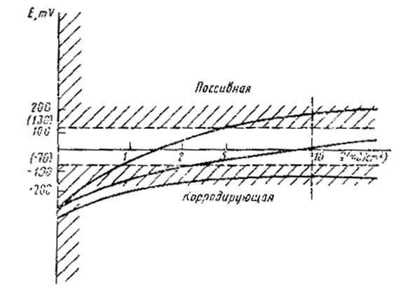 ER -остановившийся потенциал. Ep -потенциал пассивации, ED -потенциал разрушения, ip -плотность тока пассивации Черт 3 Коррозионное состояние арматурной стали при испытаниях в фильтрате водной вытяжки из бетона следует определить по показателям, приведенным в табл. 1. Коррозионное состояние стали при испытаниях бетонных образцов следует определять по плотности тока согласно табл. 2. 6.2 Гальванодинамический способ измерения Оценку состояния арматуры производят по характеру гальванодинамической кривой зависимости плотности тока от потенциала и точке на этой кривой, соответствующей прохождению количества заряда (Q), равному 10 mC/cm2. В соответствии с полученными значениями потенциала различают три области коррозионного воздействия на арматурную сталь согласно табл. 3 и черт. 4. Таблица 1