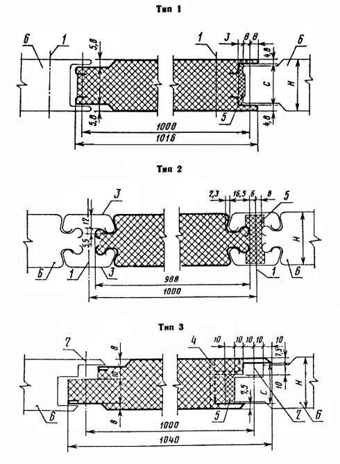 Постановлением Государственного комитета СССР по делам строительства от 29 декабря 1978 г. № 260 срок введения установлен с 01.01.1980г. Настоящий стандарт распространяется на металлические трехслойные панели с утеплителем из заливочного пенополиуретана, изготовляемые механизированными способами (непрерывным или стендовым) и предназначаемые для стен производственных зданий промышленных предприятий, эксплуатируемых в неагрессивных, слабоагрессивных, среднеагрессивных средах при температуре наружной поверхности панели от минус 65 до плюс 75 °С, температуре внутренней поверхности панели до плюс 30 °С, относительной влажности воздуха внутри помещений не более 60 %. При разработке проектов зданий со стенами из таких панелей следует выполнять требования Инструкции по проектированию зданий из легких металлических конструкций, утвержденной Госстроем СССР. 1. ТИПЫ И РАЗМЕРЫ1.1. Панели по очертанию поперечного сечения продольных кромок подразделяют на типы: 1 - панели с разными продольными кромками - одна в виде паза, другая в виде гребня, симметричными по толщине панели, которые образуют стыки в шпунт; 2 - панели с одинаковыми кромками в виде выступов - «кулачков», стыки этих панелей перекрываются пружинными нащельниками - вкладышами. 3 -панели с разными продольными кромками - одна в виде паза, другая в виде гребня, несимметричными по толщине панели, которые образуют стыки в шпунт. Очертания поперечных сечений панелей приведены на черт. 1. 1 - крепежный и стяжной болт; 2 - самонарезающий винт; 3 - пружинный нащельник-вкладыш; 4 - пластмассовая закладная деталь; 5 - эластичная прокладка; 6 - примыкающая панель; Н - толщина панели Черт. 1 1.2. Основные проектные размеры рядовых панелей должны соответствовать указанным в табл. 1. Таблица 1 мм